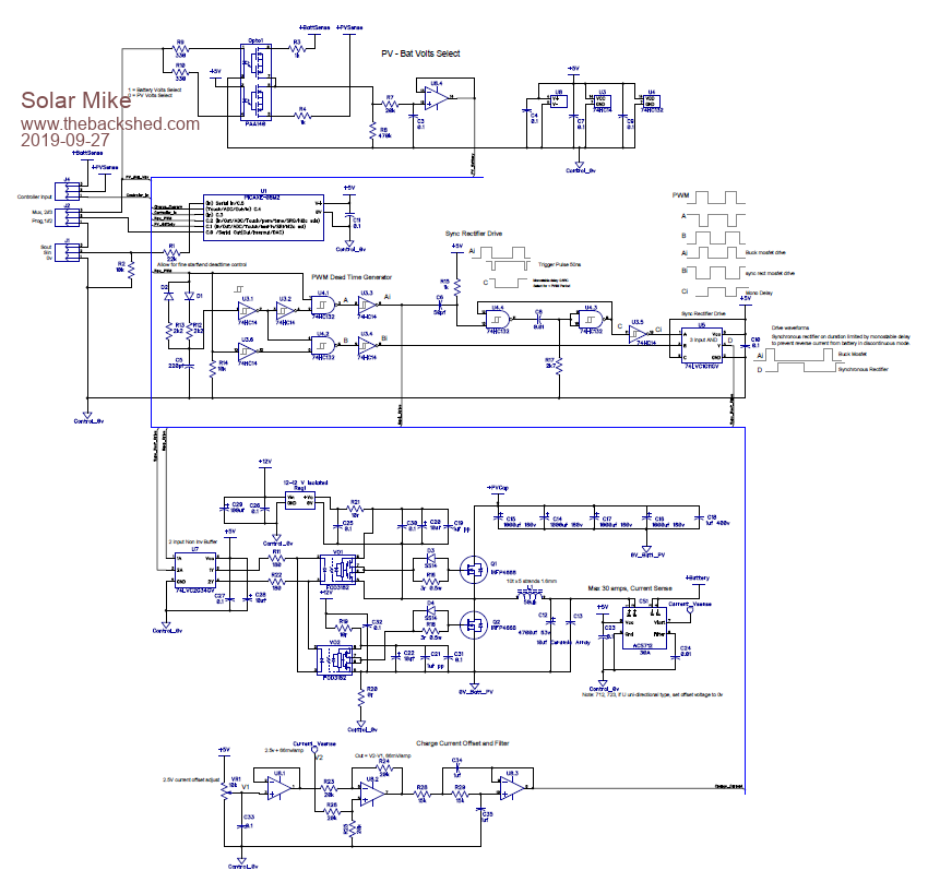 I have always wanted to experiment building a multiple phase mppt charge controller, this is where multiple mppt sub controllers combine their outputs whilst being sourced from a common PV supply. Reason being, having multiple phases allows for smaller inductors and capacitors, lower currents in the buck converter and less losses. The design would allow for adding on extra phase stages as required, depending on how much power is wanted, ie modular. However each buck stage has to be semi-autonomous, with its own voltage and current control, so gets pretty complex very quickly. A multiple phase example would be say every 60 degrees a buck inverter completes its switch cycle, thus over a 360 degree period 6 cycles would occur from 6 combined buck stages. There are specialized chips out now as used in multi-phase mother board power supplies that do this and more, but they are very specialized, I want something more generic. My thoughts were to use an 8 pin PIC cpu in each buck converter or perhaps an ATTiny85, as I have lots of spare Picaxe 08M2 chips, thought that would be a good starting point. With this chip we can have 32Khz background PWM with 1024 bit resolution or higher pwm speeds but less resolution and a 32Mhz cpu clock speed. All the chip has to do is measure its output current and voltage, limiting the voltage to a master reference input whilst running an mppt algorithm. If I use say 5 buck circuits each limited to 30 amps, then only 2 mosfets are required in each, one for the buck stage, other for the synchronous rectifier. This gives a respectable potential of 150 amps @50vdc or 7.5KW output, all using small easily obtainable inductor cores. In comparison the other 3KW charge controller design at 100 odd amps output uses humongous cores that are only obtainable direct from the factory in the USA. However having multiple controllers with their own clocks etc does not give a true synchronous phase locked output, more like a random frequency and phase; which may work just as well. Here is the proposed design. SlaveMppt.pdf The circuit here is a slave mppt controller that will be built on a smallish PCB, multiple pcb's can be stacked together to give the desired current output. A host controller of some sort will tell each slave what voltage and current to regulate to, along with the operation mode (bulk, equalize, float etc). However for testing the host isnt required initially as voltage set points can be code constants. Voltage sense is multiplexed to a single pin, current is measured by the commonly available Allegro ACS 712 or 723, single CPU PWM output is split up into non-overlapping buck and synchronous rectifier drive signals, the sync rect. especially has its on period limited by monostable timeout to prevent havoc caused by battery current back feed into the buck circuit during times of discontinuous operation. I attempted to breadboard some of this and gave up, rats nest of wires just doesn't work here; so will go straight to pcb. Am also testing the other 3KW mppt controller design, code is very similar, so will be interesting to compare both designs. Cheers Mike Edited 2019-09-27 21:17 by Solar Mike |
