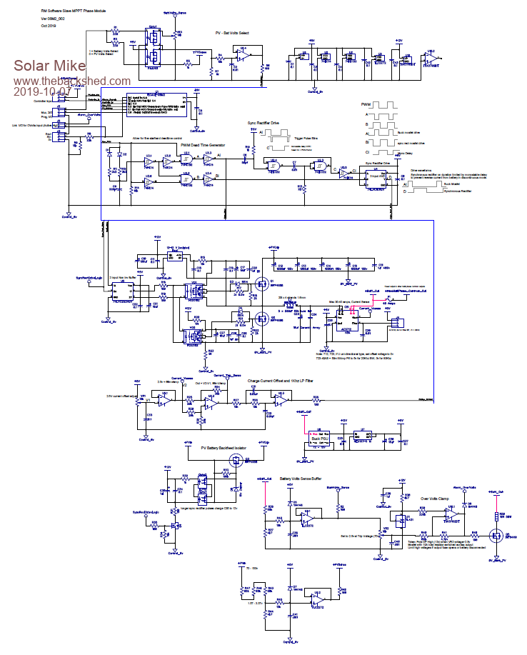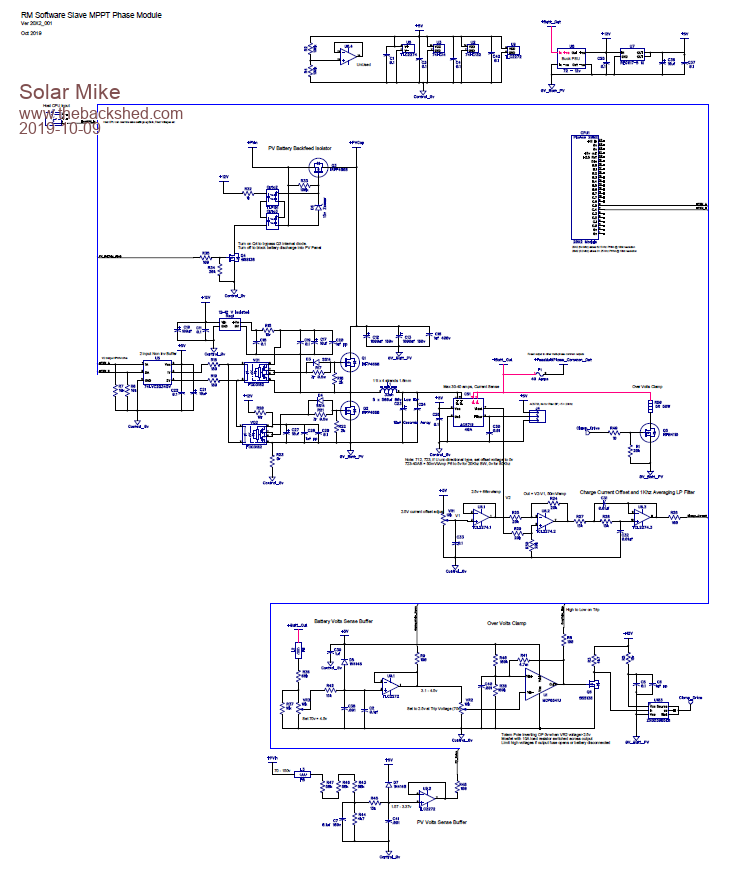 Interesting idea, single CPU only required, it would have a lot of work to do managing everything.?? I have made a start on the PCB, realized needs some extra complexity to allow each slave unit to run standalone if required; have decided to use the higher current ACS723-40 current sensor (40A), the older cheap as chips ACS712-30 is no longer made nor recommended for new designs, but easier to get on AliExpress etc. Newer 723's have 1/2 the through resistance so less heat. Another mod is for each module, control its own PV Isolation Mosfet, I was going to have this on the Main Host board, normally multiple parallel devices, but it makes sense to place with each slave, also helps allow the slave be run as standalone. As these modules will have their own 40 fuse link joining to the common battery buss, there needs to be some mechanism to detect a blown fuse or perhaps the main battery breaker popping out, consequence of this event whilst under high charge is Buck voltages sudden dramatic increase to blow every thing up levels. Have opted for comparator sensing the voltage increase and turn on a clamp mosfet, placing a heavy load across the module, independent of CPU, this gives CPU time to shut everything down before its 5v rail dies and the perhaps sacrificial 5R power resistor going up in smoke. Connected to the last available pin on the PIC, serial input, can also be used as a Pull High input switch (detected by interrupt). SlaveMppt_002.pdf Cheers Mike Edited 2019-10-08 06:06 by Solar Mike |