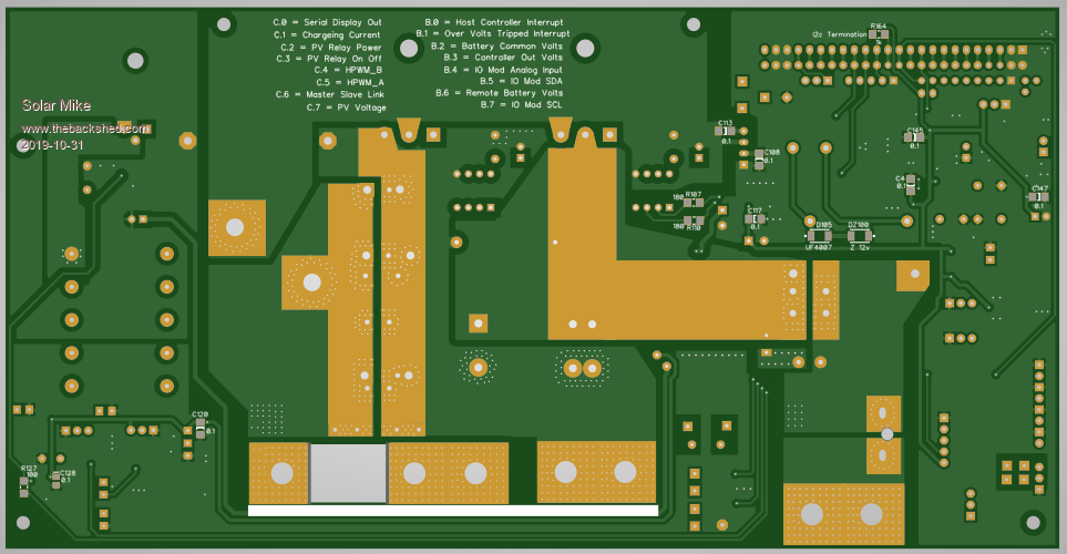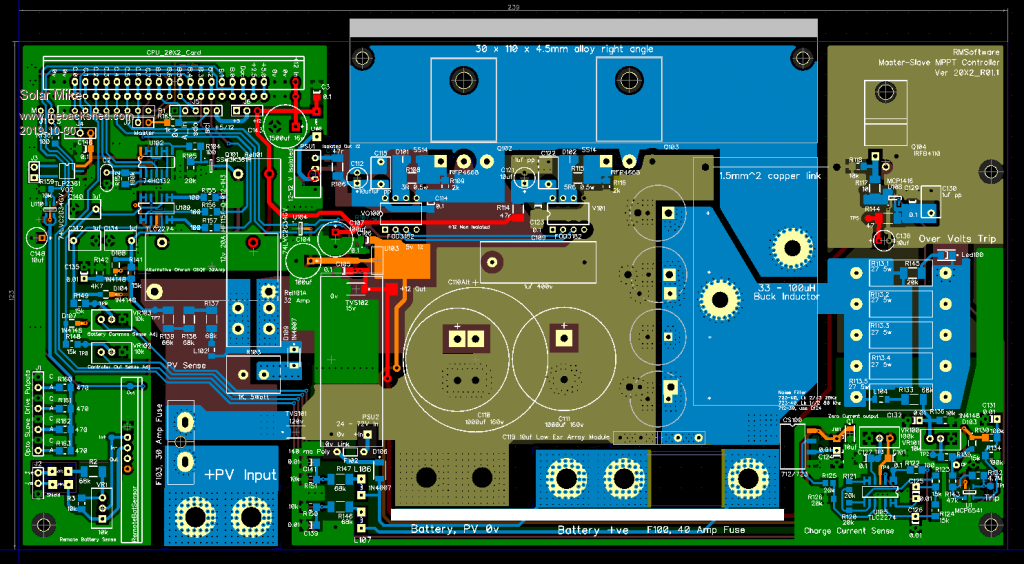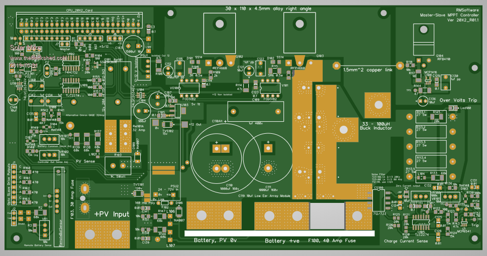 Past few weeks in between renovating a house, have spent some more time on this project, after several iterations, changes in circuit design, a pcb has been laid out and will be sent to China for manufacture tomorrow. Final circuit uses a PICAxe 20X2 running at 64 Mhz, mounted on a plug in pcb as the brains, using its 1/2 bridge output mode to drive the buck converter and the synchronous rectifier, gave away the idea of using the mini 8 pin device, not enough IO's and too slow. Each mppt module is using a 40 amp current sensor chip, so would expect max output charge current be limited to less than that. This keeps the buck inductor to a reasonable size. Biggest change to the circuit is replacing the PV - Battery isolation mosfet with a small high power pcb relay, there are 2 variations on this, one using a 20A relay, the other is a 30 amp, pcb allows for either. The circuit also has a relay coil minimiser drive to reduce the coil dissipation should the larger relay be used. The use of a relay gives a more robust isolation than using a single mosfet. As the cpu has more IO, have made the most of available pins, the original idea was each mppt module acts as a slave device, having a master to control multiples connected on parallel; now by setting a link the module acts as a master and can control 4 other slaves, this will make it easier to test and setup. Also added are optional remote battery sense using a differential amp board, I2C outputs to an extra IO display, relay PCB and a serial LCD output. A lot of attention has been on the earthing and current paths, star earthing used with control and power 0v rails separated and joined in one place only. PCB also allows for different main capacitor combinations (sizes) as I will be testing for two PV voltages of 110v and 165V, max input voltage would be 200v due to 1.5mm pcb trace clearances. SlaveMppt_20X2R01.1.pdf Cheers Mike Edited 2019-10-31 07:05 by Solar Mike |