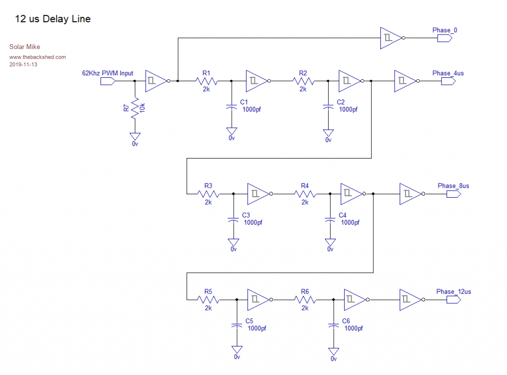 Had another think about this, the maximum number of phases I will want is 4 maybe 5, if I go for a 62Khz PWM master clock, the min pwm duty cycle will be > 5us assuming the PV voltage is 2-3x the battery voltage. As I dont have any small fast cpu chips suitable, there is always a simpler way... With a 16us period the easiest way to get multiple phases is to use a simple RC delay line, with say 2us elements. This will pass any pwm duty > 2us with full 1024 bit resolution, I tap off the 0,4,8,12 us delay points and take each one to a buck converter pcb module. Rather than use 74HC14 schmitt inverters as per the generic circuit here, I could use a single 8 input schmitt input buffer 74HC541. Cheers Mike |