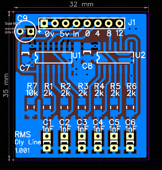 The last time I built a delay line was over 30 years ago, used to use them to get correct timing signals for driving dynamic ram chips driven by Z80 cpu. Guess there is no call for them now except for Audio reverb and sound effects. I haven't tested this one, all theoretical design, as per the rest of this project. PCB almost done, difficult to squeeze these power components into a 100mm pcb. Cheers Mike |