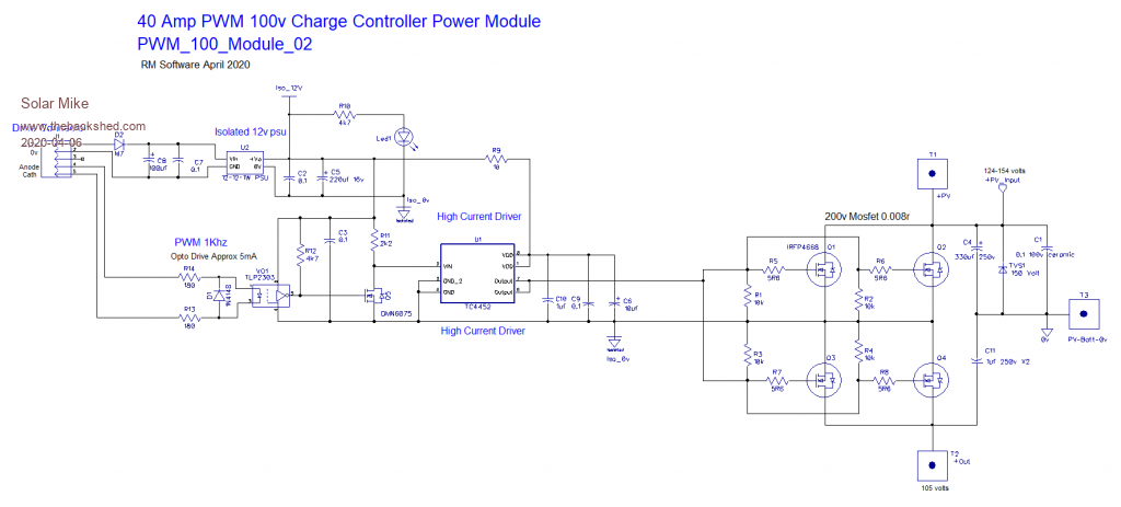The design could also be made more efficient if dual mosfets were used in both the PV-Battery isolation switch and the buck inverter, a single 80 amp rated rectifier will be fine as is. If the design is used at lower voltages say 48v, then the currents are higher and better shared by dual devices.