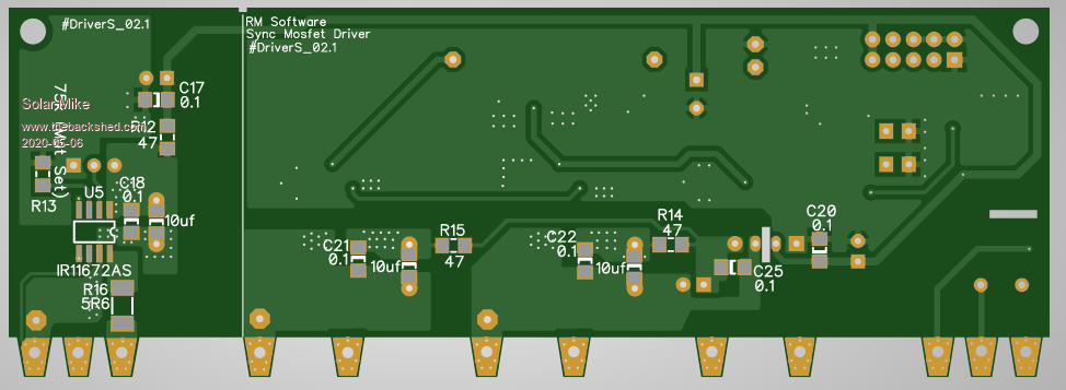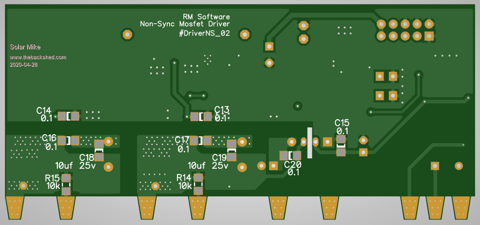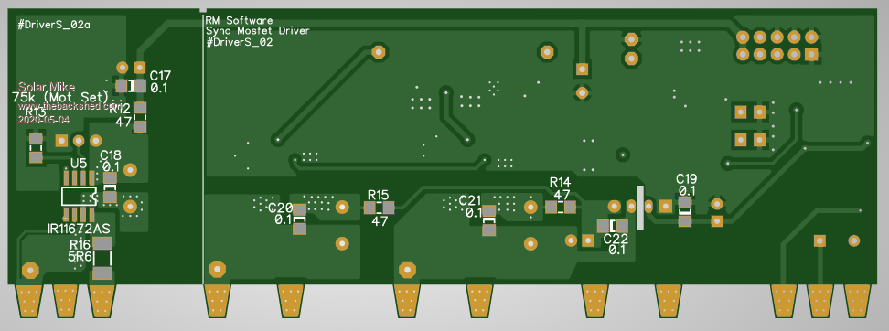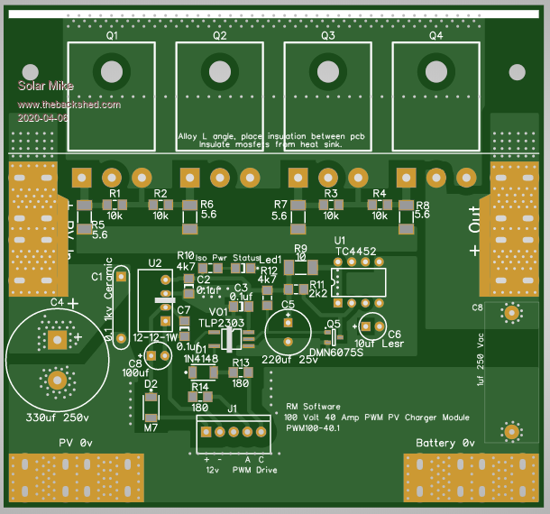 Here is the layout for the driver board, it measures 41mm high by 100mm long and sits on top of the 4 mosfet pcb pads; the mosfets are bolted 28mm apart.