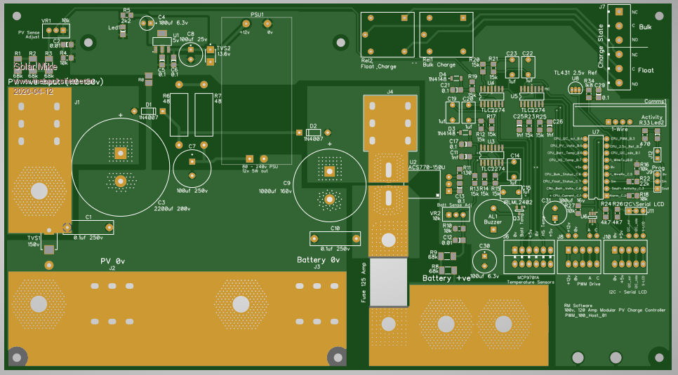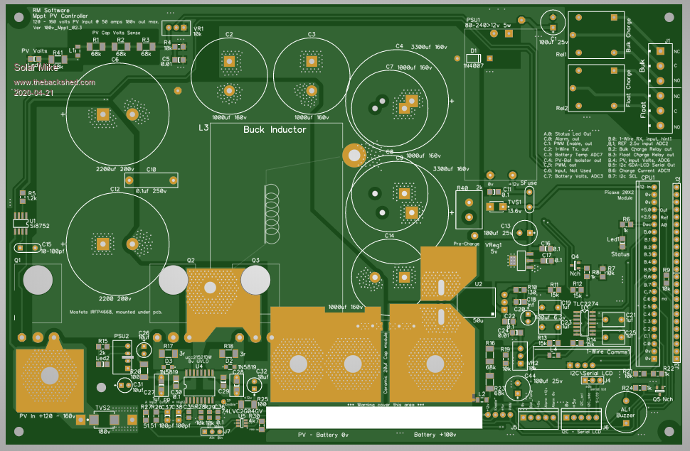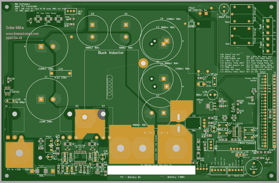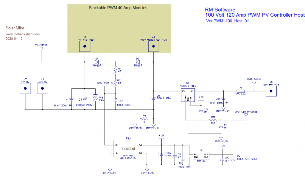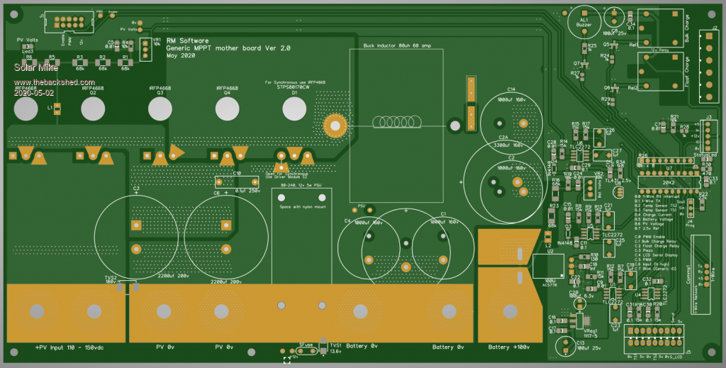Have made a start on the host controller mother board that can have 1 to 4 PWM power modules fitted; it is a similar layout to the previous design multi-phase mppt controller, except everything is single phase, the only time we have PWM control is when battery voltages need limiting at full charge or on float etc.