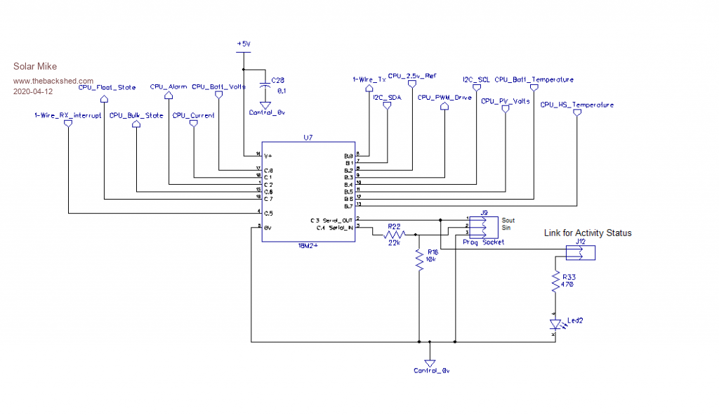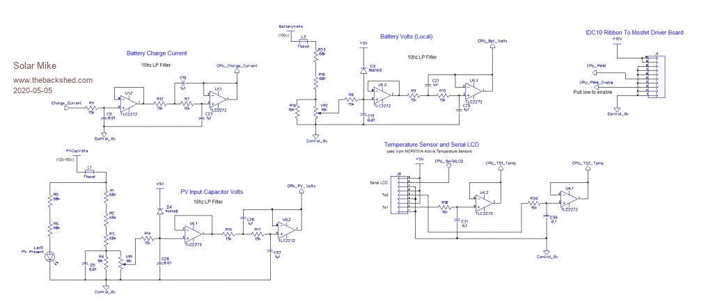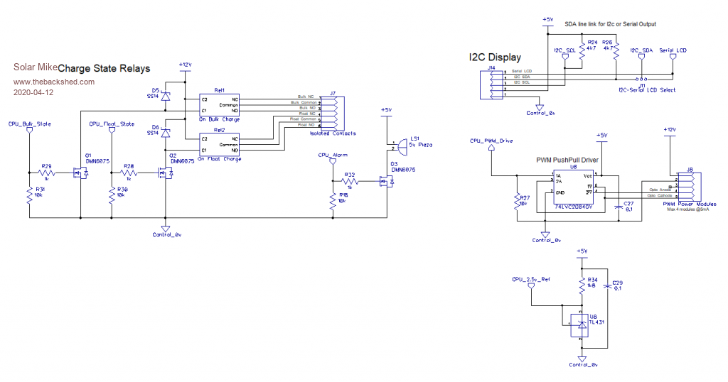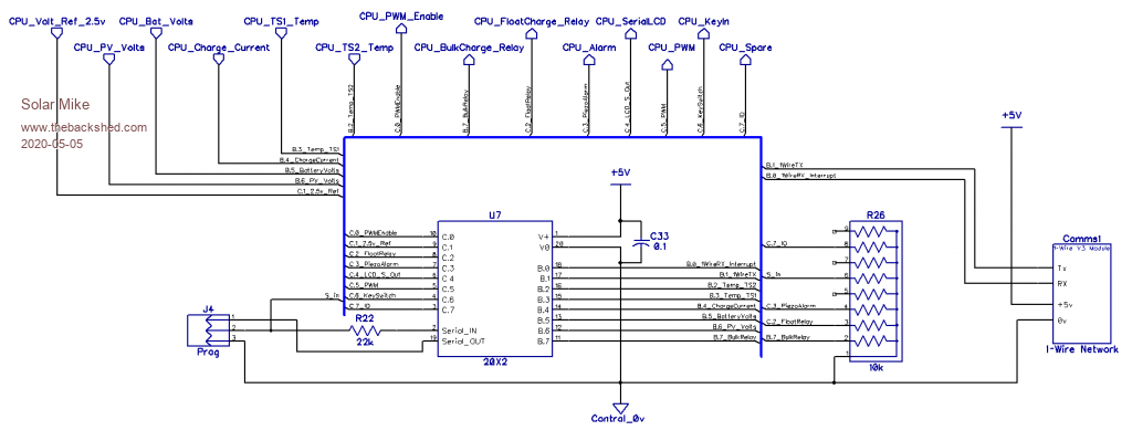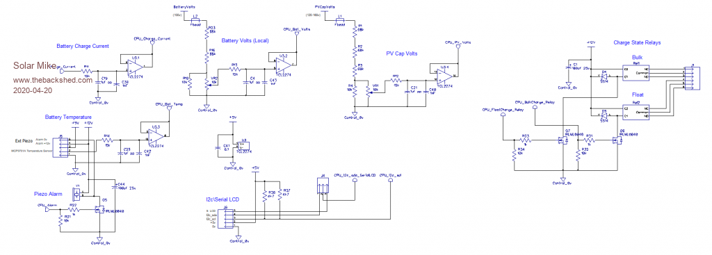 This design based on a single Picaxe 18M2+ cpu, as I found a box of them in my junk pile, thus the limited IO input count in the design, IO for temperature sensors, sensing for PV and Battery voltage, Charge Current, I2C or Serial LCD display. I haven't allowed for a keypad to enter various voltage settings, decided those set points can be entered via the code parameters.