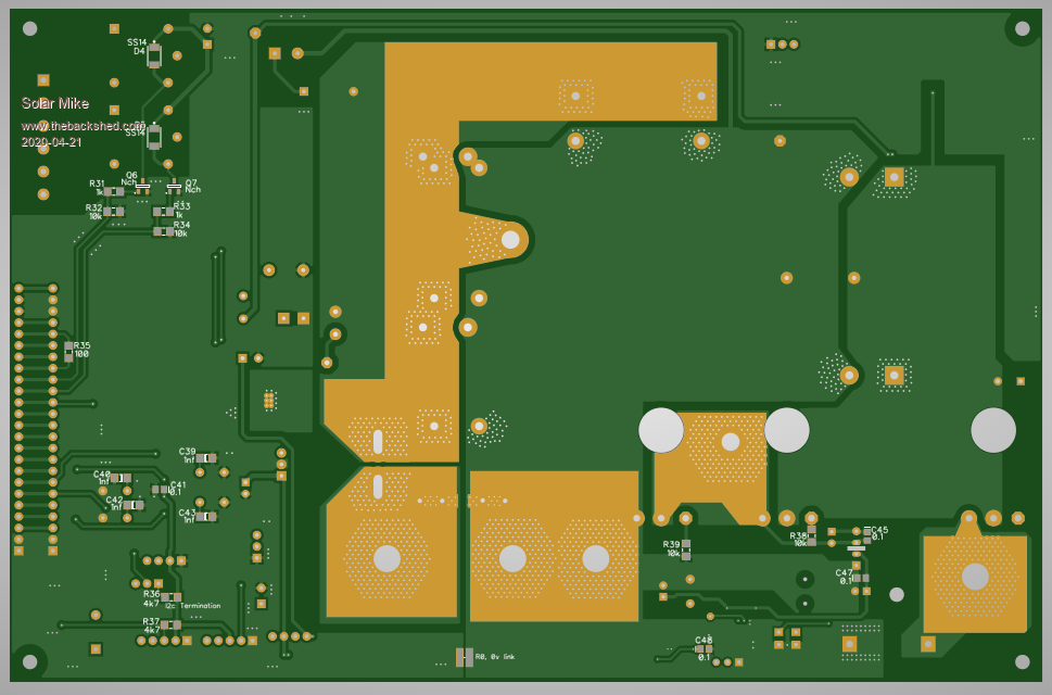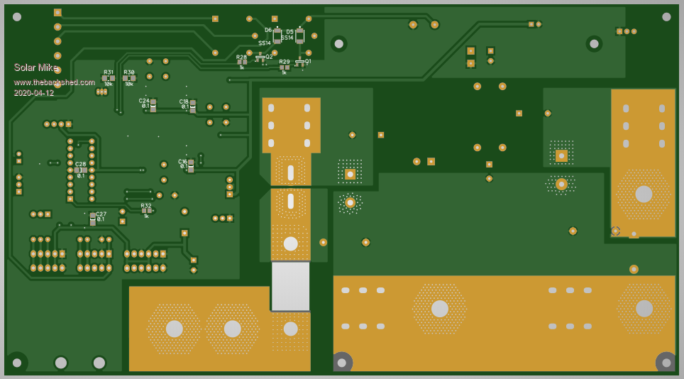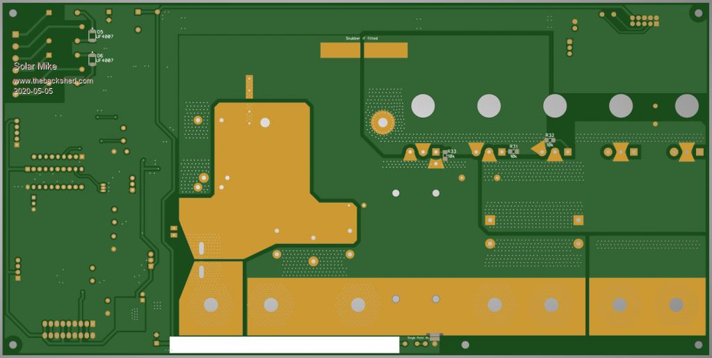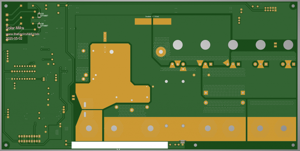 Have yet to send the above gerbers off, as the only way to get them delivered now is by courier, DHL, which costs more than the boards. So have also designed over the past few days an mppt synchronous board suitable for 100v battery banks. Will get this design finalized and ordered in the one delivery.