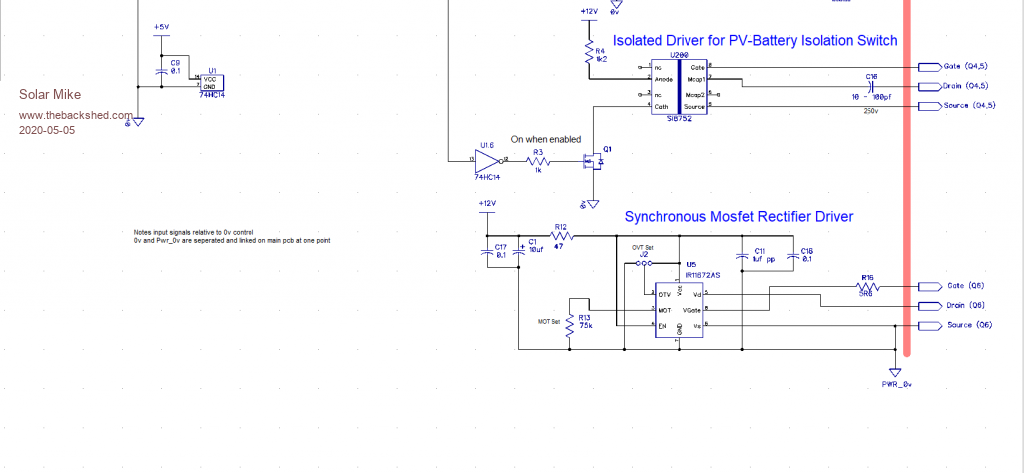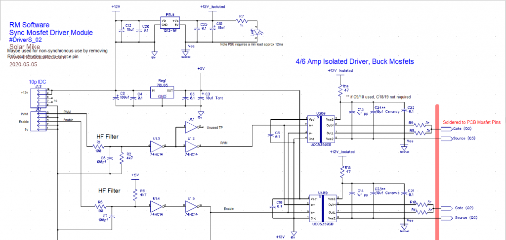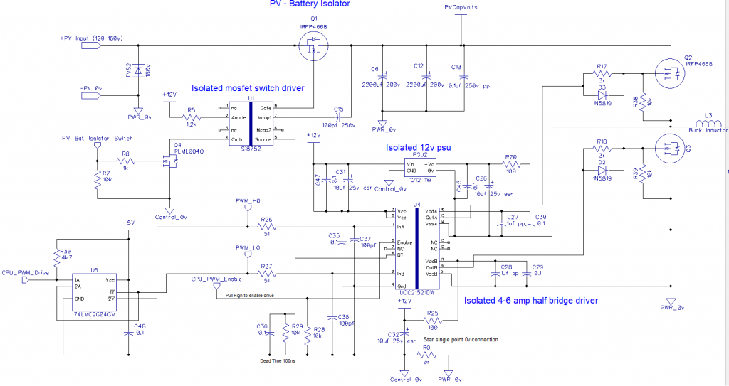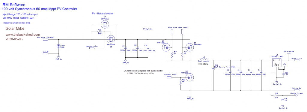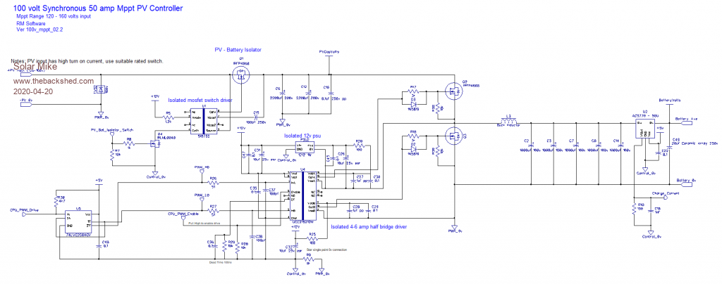 Schematic for the generic Mppt PV charge controller, can be either fully synchronous or not, depending on components. The driver pcb solders direct to the mosfet pcb pads for optimal layout.