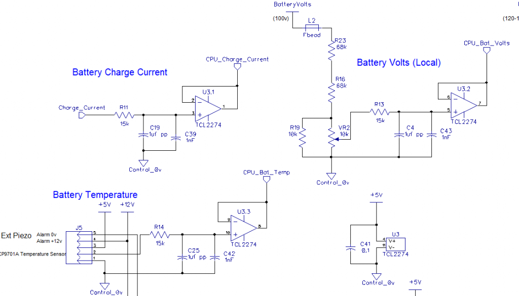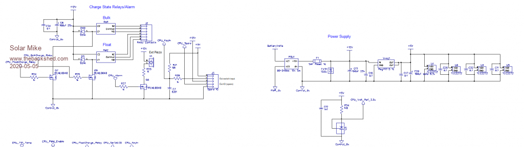 Showing charge state relay outputs, piezo alarm, LCD display, cpu voltage ref and push pull PWM driver,