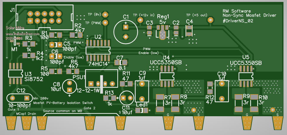 I have used the UCC5350SB isolated 4/6 amp drivers, one for each mosfet in the buck switch. The slower PV-battery isolator is driven from the isolated voltage generator Si8752 chip.