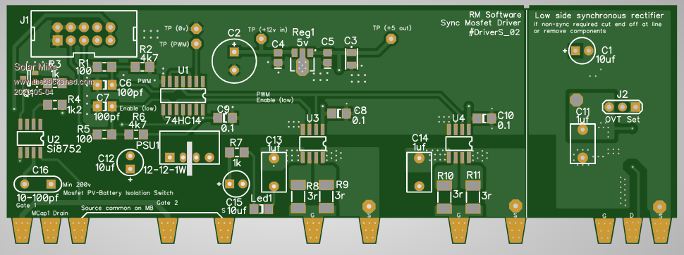 I have made some modifications to the mosfet driver module; now it can be used to drive either a synchronous mosfet rectifier following the buck switch or not use a mosfet and replace with a dual 170v 80 amp schottky diode in non -synchronous arrangement. At a pinch the sync mosfet may be left in cct and its gate shorted to source, in effect using the internal diode as a rectifier; note not recommended as the voltage drop is quite high at larger currents.