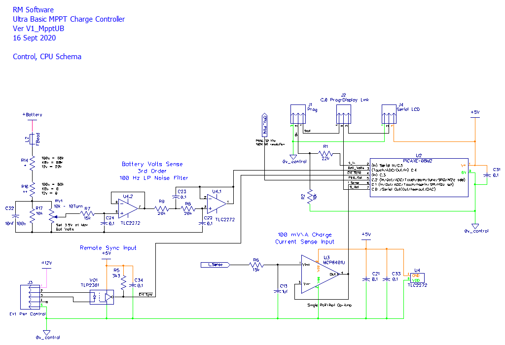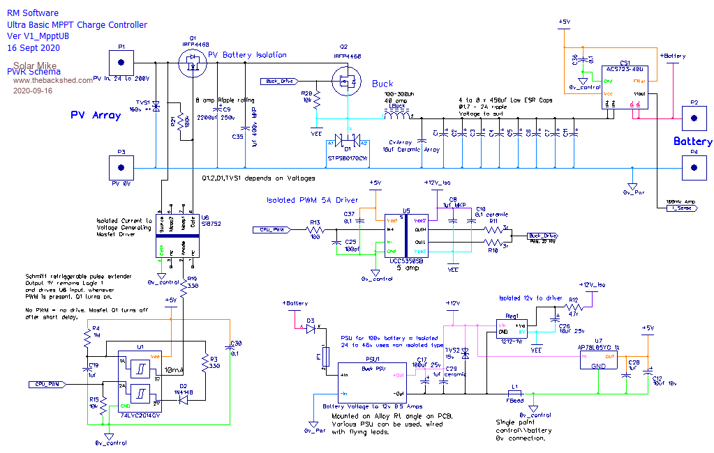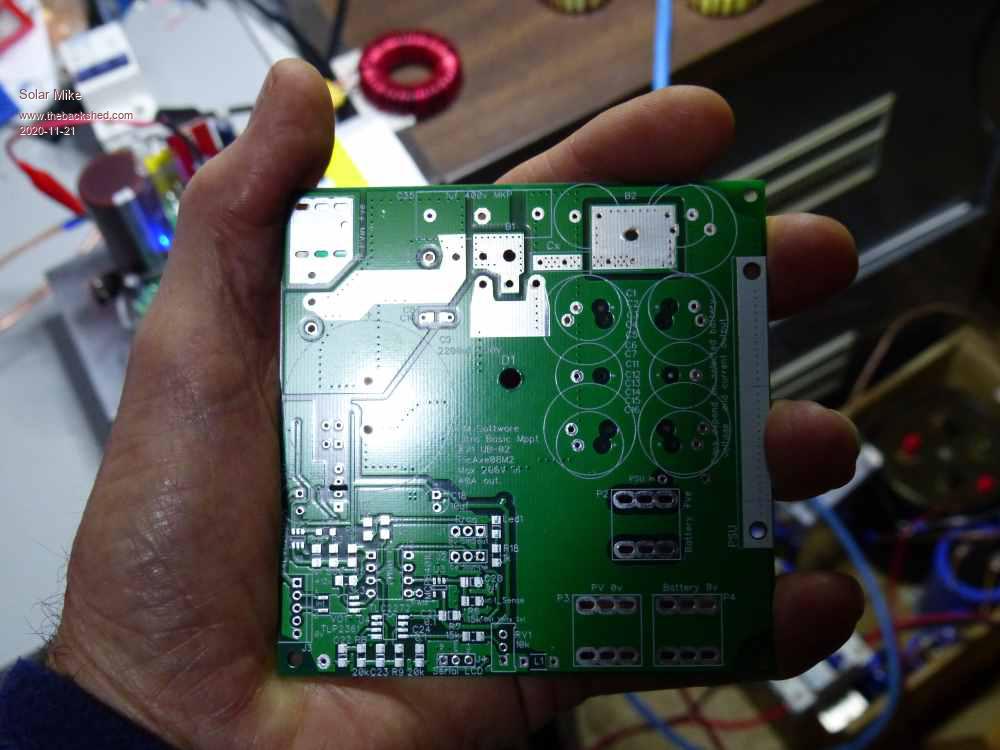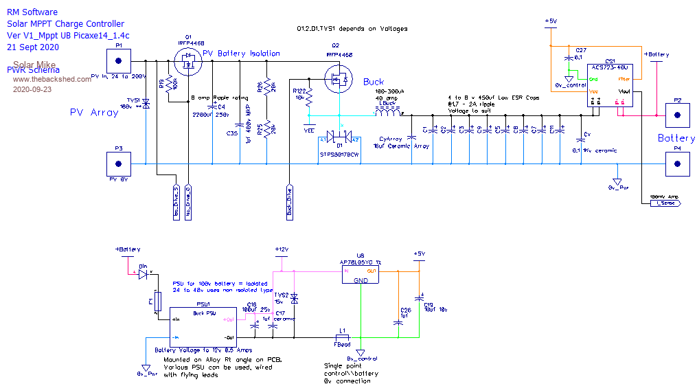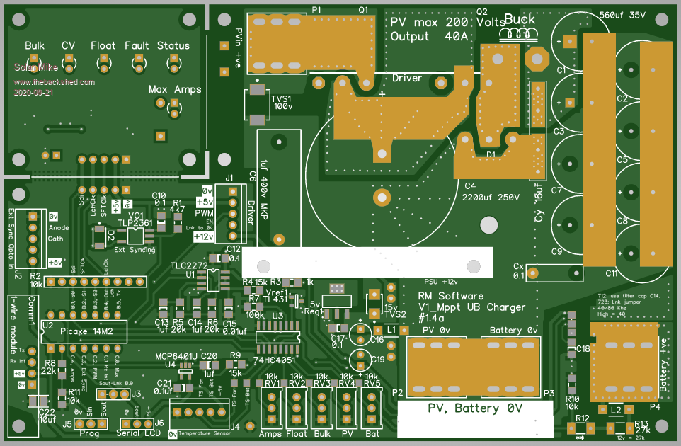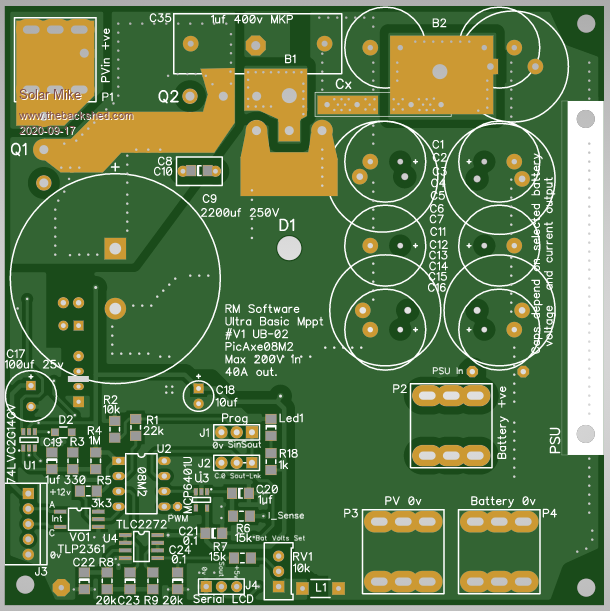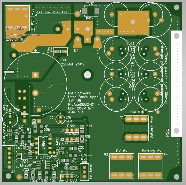 Is it possible to build a MPPT PV Charge Controller using a Picaxe 8pin CPU. I have always wanted to have a go at implementing this ultra basic type of design, using minimal CPU control IO. Spec is up to 200 volts input, 40 amps max output, with any battery voltage between 12 and 100 Volts, fit on a 100 x 100 1oz copper PCB and no fancy external plug in modular components; and most importantly only use an 8 pin CPU. Here's my attempt: ![]() ![]() More later on how it works... Edit: Couple of items missing on PCB, will add them and update. Cheers Mike Edited 2020-09-16 23:02 by Solar Mike |