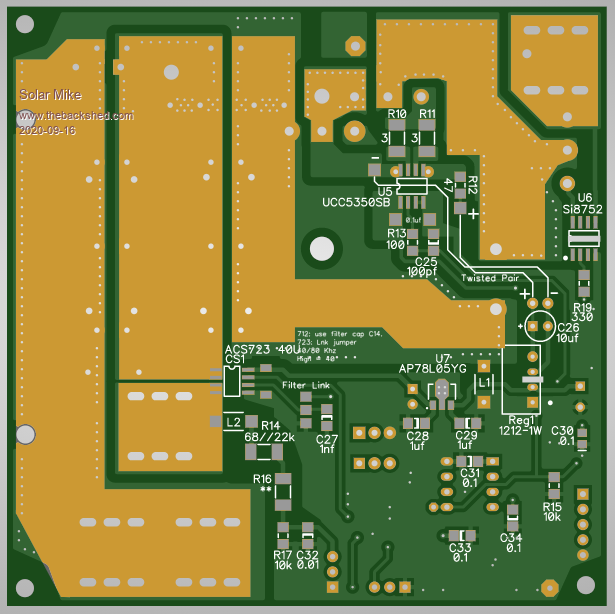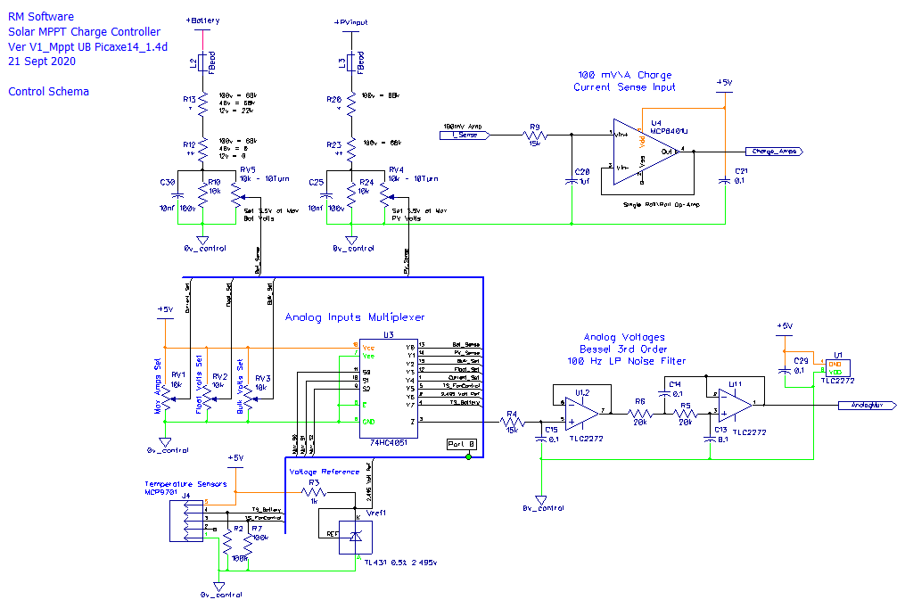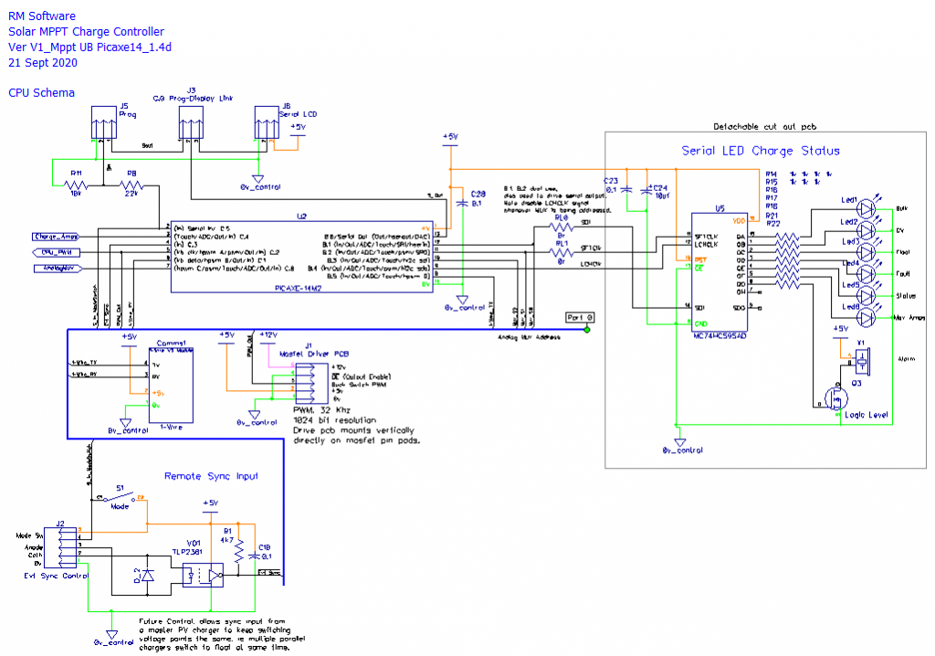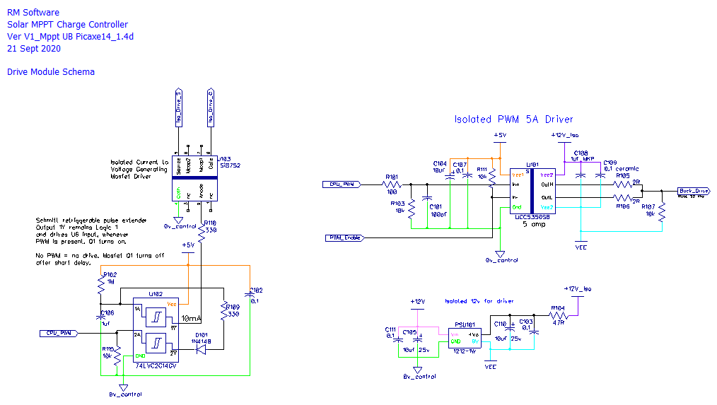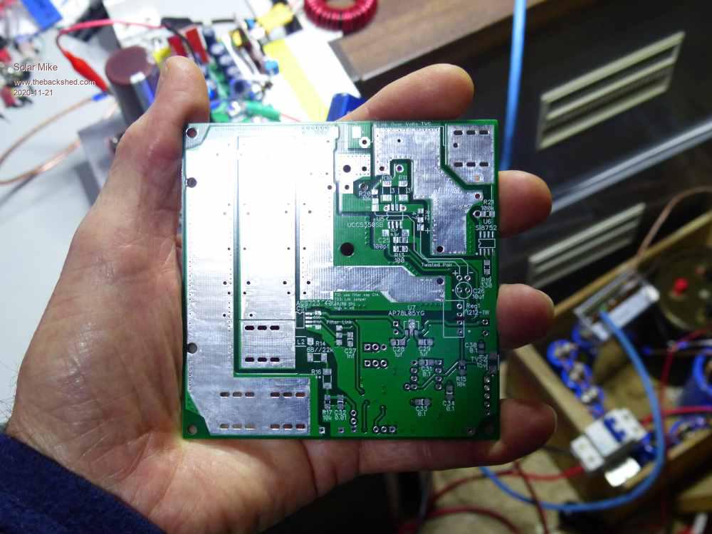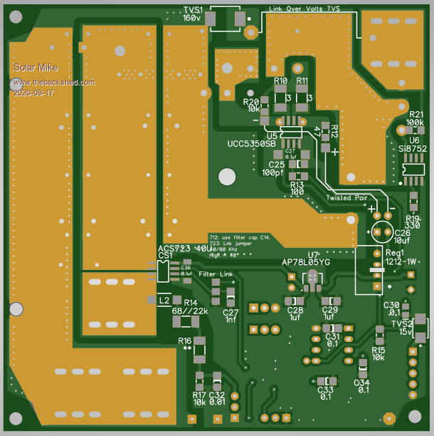 Is it possible to build a MPPT PV Charge Controller using a Picaxe 8pin CPU. I have always wanted to have a go at implementing this ultra basic type of design, using minimal CPU control IO. Spec is up to 200 volts input, 40 amps max output, with any battery voltage between 12 and 100 Volts, fit on a 100 x 100 1oz copper PCB and no fancy external plug in modular components; and most importantly only use an 8 pin CPU. Here's my attempt: ![]() ![]() More later on how it works... Edit: Couple of items missing on PCB, will add them and update. Cheers Mike Edited 2020-09-16 23:02 by Solar Mike |