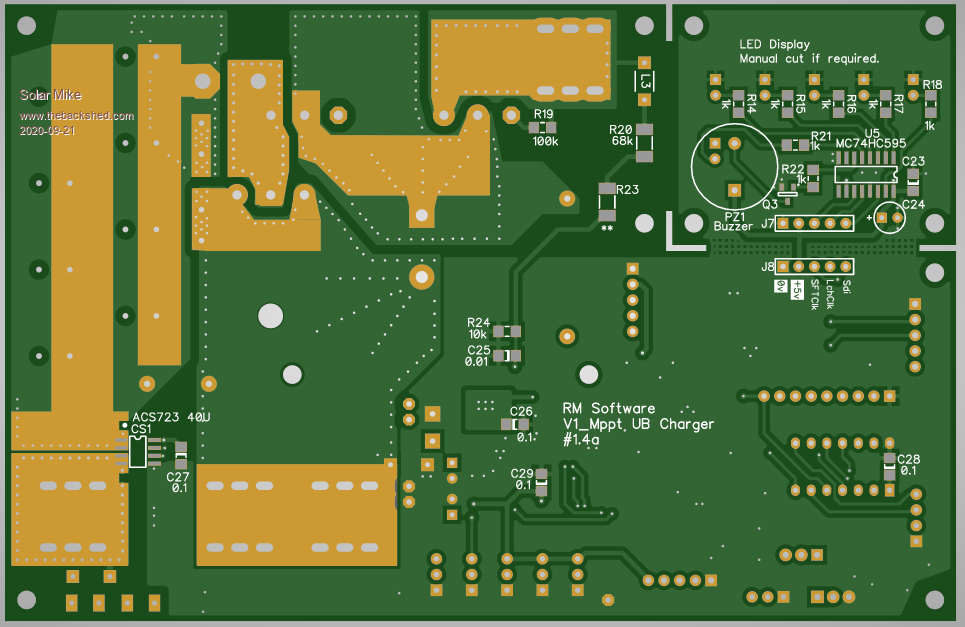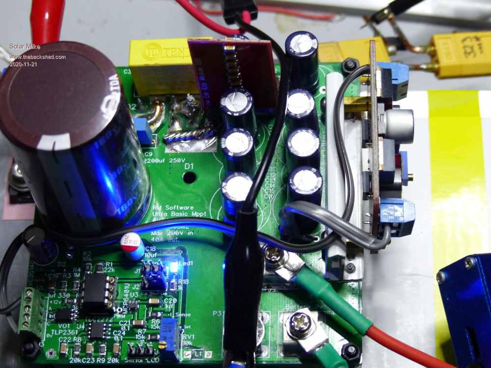 Update: 08M2 version, software has been modified somewhat and been in various stages of test over the past few weeks, mppt code now works much better than my previous attempt. Testing on a 300W panel roof mounted, tracks in all light conditions from full sun, down to fractions of an amp at near dusk. Using a PSU with current limiting to simulate a PV panel 20A continuous is fine, nothing over heats, 30A would be the top end for the inductor I'm using, would need thicker wire; 40A would be the limit of this design. Current code and gerber files attached. Have a good Christmas all. V1_MPPT_UB_08M_2.zip Gerbers_UB.zip Cheers Mike |