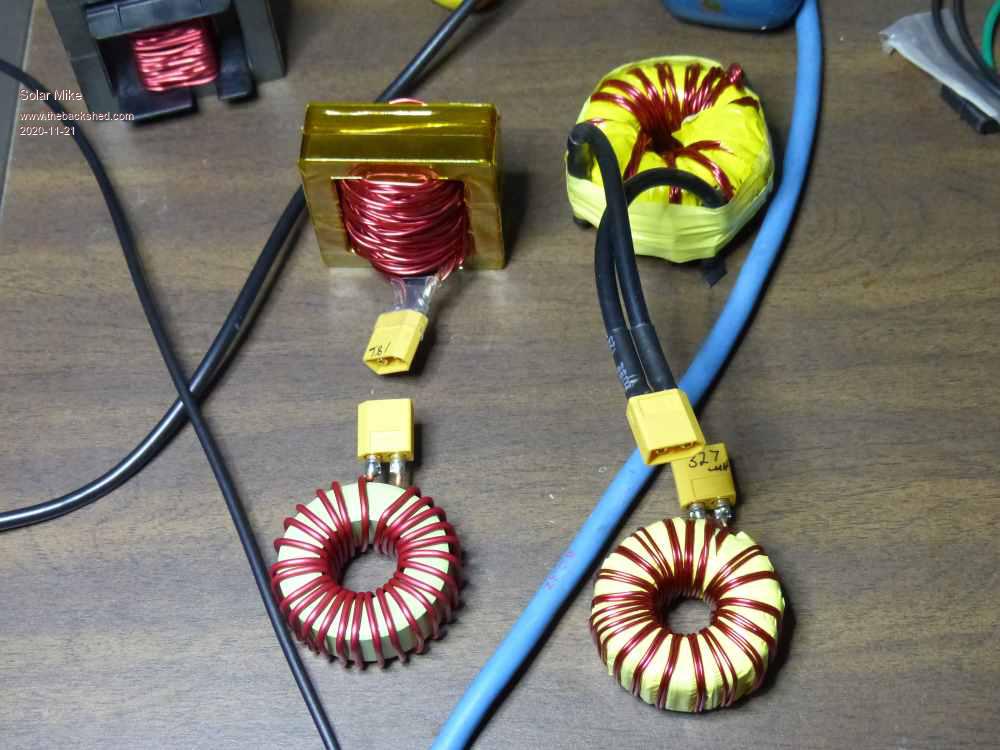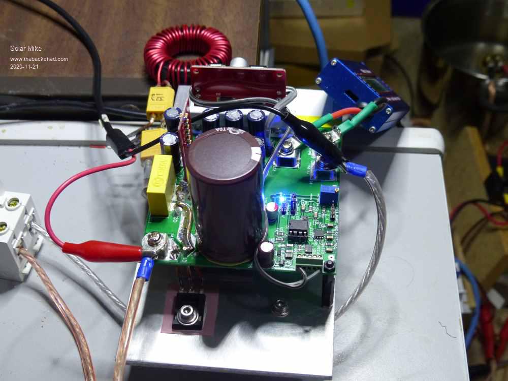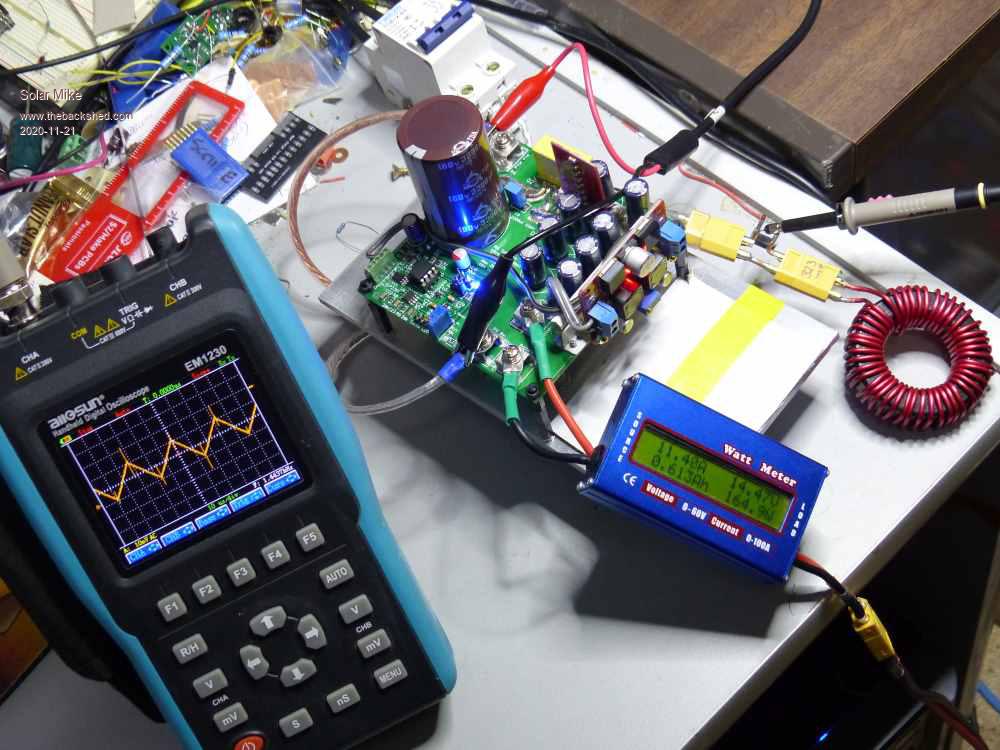 Its been awhile since I reported progress on this design, the first design using the PicAxe 08M2 has been built and software written. No errors on the pcb which is great; Here are some photo's. Bare PCB: Populated showing input mosfet. Notice the 5mm^2 copper wire soldered to pcb, as the prototype is only 1oz copper Closeup of top half, Big cap is 3300uf 160v, smaller ones on output are 8 x 470uf 35v @1.8amp ripple rating, there are too many here will take some off and re-test. The tall red pcb has an array of 20 x 1uf 100V smd ceramics mounted where the buck coil connects to the +ve out. The 12v DC power supply module is mounted on RHS on a scrap of alloy, its one of those buck/boost types so will output 12v from any input from 6 to 32v, 5v regulator is on the main board. Selection of buck inductors, have connected via XT60 plugs and sockets for ease of swapping out. The square ECore is a Iron Powder E220-52, 43 turns of 4 strands 1.2mm dia wire, 186uH, Big Yellow with black leads Micrometals T200-26B, 44T same 4 strands 262uH, other yellow is T200-52B only 2 strands 327uH, Green is T200-52B with 26T 2mm dia wire 100uH, one connected to pcb under test is one of those sendust 56mm AS125 cores fully wound with 2mm dia wire, 323uH. They all gave very good results near the 12A testing so far. Under test with 11 - 12 amps to 12Volt lead battery and load sitting in a bucket of water, I need to make another load to test it at 20+ amps. The isolated hand held storage scope shows the AC current waveform through the buck inductor, I'm using a precision 0.01 ohm smd 5W resistor in series with the coil for the scope probe sense. The ac current @12 amps DC was 2 amps. Others at 12A 100uH 3A, 262uH 1.4A, 327 1.3A, ECore 1.3A Input voltage for testing was 30V psu with variable constant current setting, the higher the voltage the more inductance is required. Have used an IRFP4568 (150v 5mR) in the input and a IRFP4668 (200V 8mR) as buck switch, and a 180v dual Schottky. I want to test on a 50V battery with 130V input, thus current mosfets used. This design will be used on a number of 12V and 24V batteries 15-20A max so would be more efficient to use lower voltage lower R mosfets. At 12A efficiency is 92%, the mosfets are bolted to a 5mm alloy plate with a small finned HS, which won't be doing anything sitting upside down on my bench, after an hour @12A it barely gets warm, The main input cap is warm approx 35c, nothing else on the pcb gets warm. Inductors except the 100uH are just warm at about 30c. Will post the code on the PicAxe forum, current based mppt algorithm works pretty well, took awhile to sort out, connected it to a low voltage 16Vmp 150W panel on the roof this afternoon in the dying hour of not much sun, tracked quite well; PWM is 32Khz 10bit resolution. More testing tomorrow... Cheers Mike |