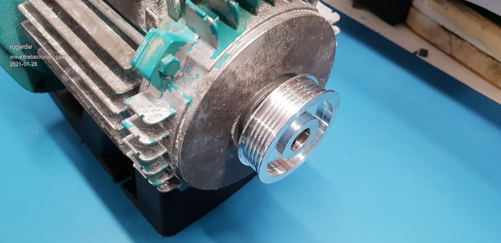 It only needed about half a mm off to accept the new pulley ... so it was a pretty simple exercise, if somewhat rough! A couple of grub screws holds it firmly in place.