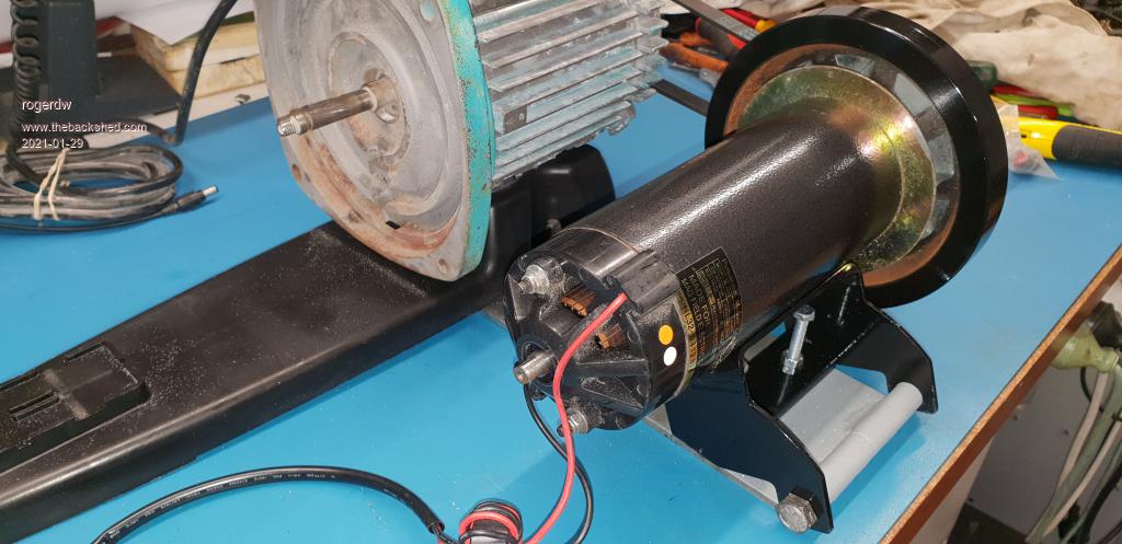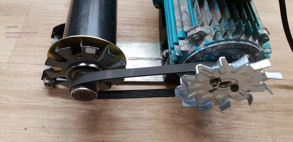 With the first treadmill motor and under Tony's guidance, I had removed the flywheel section of the treadmill motor pulley so that when I needed to run it on AC ... the AC motor wouldn't have such a hard job to get it up to speed.