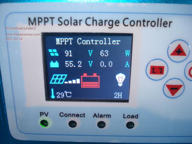 Yet, my batteries are being charged, because the controller shuts down around 55 volts. and the battery symbol shows a full charged battery, plus I've seen the PV green light (led),the bottom lefthand indicator LED on the bottom row of LEDS) extinguish for a short time before it charges again.
