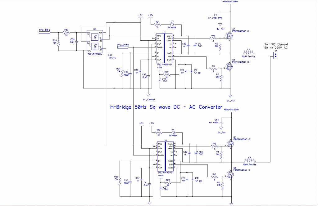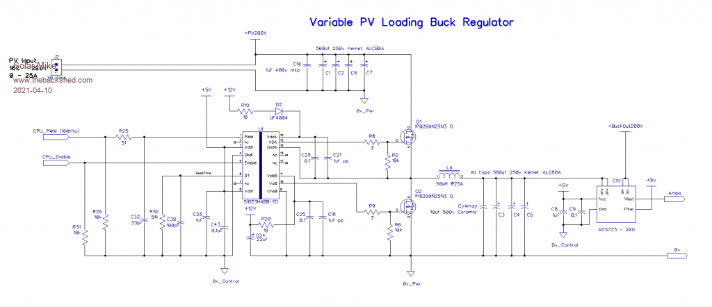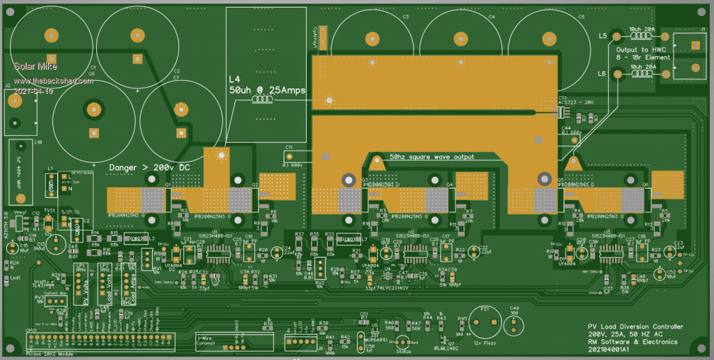 In order for this scheme to work the diverter should start loading up the PV array just above the expected MPPT voltage, as the array volts go above the MPPT point when the charge controllers start unloading the battery as it nears fully charged. I have elected to use a simple buck converter to place a variable controlled load on the array, the buck output powers an H-Bridge arrangement to convert the variable DC power to square wave AC at 50hz, thus allowing the standard thermostat and over temperature protection to work as normal. I have used surface mount DPak 250v 88A mosfets, with the bottom of the pcb insulated and clamped to an alloy bar 25mm wide bolted to the case, with up to max loading of 20 amps or so they are only dissipating a few watts each. PWM to the buck converter is 100Khz, and 50% duty 50hz to the H-Bridge.