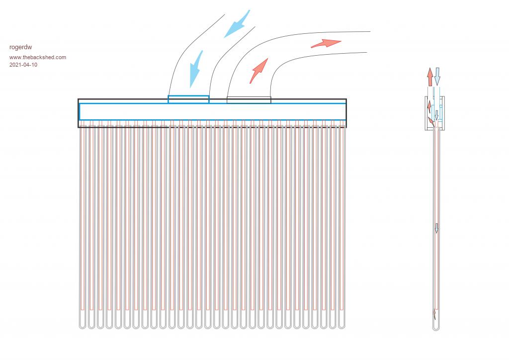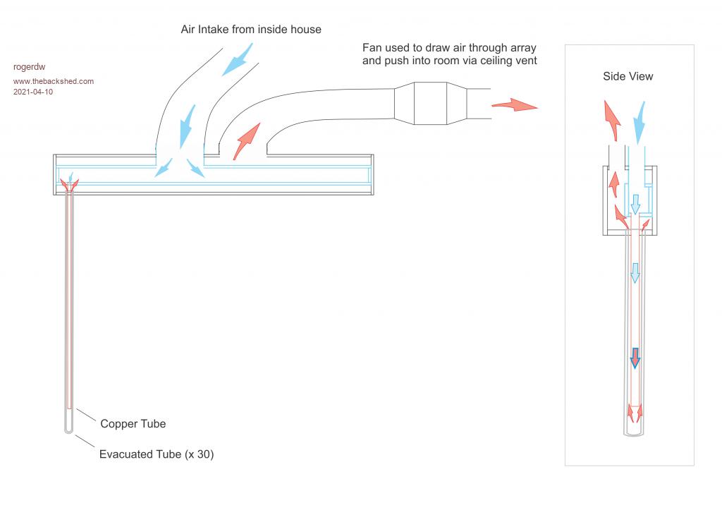 Hopefully the concept will be obvious. The plan is to hang copper (or steel) tubes out of the bottom of a manifold ... into the evacuated tubes. Then, using an inline fan in the outlet to draw air from inside the house into the heater ... ... where it travels down the centre of the copper tubes and flows back up between the outside of the copper and the inner glass tube ... gaining heat all the way through ... ... and expel it back into the home via a ceiling vent. Edit: I forgot to mention that in this design I would hang them on a north facing wall and have the inlet and outlet open into the area above the eave. Could also create a version to lay on the roof, though fitting ducting through the tiles becomes a bit problematic. My first design was also to mount on the wall, but with horizontal tubes ... with the outlets designed to go through a partially open sliding window. ![]() ![]() Edited 2021-04-11 00:06 by rogerdw Cheers, Roger |
