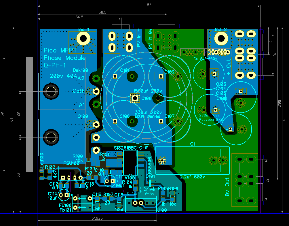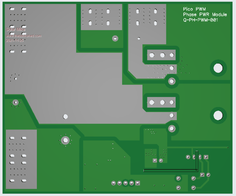 Modular construction opens up more possibilities; the Pico with its high speed State Machines can be setup to output multiple synchronized phases of high speed PWM very easily. This allows me to have a design that can host 1-3 MPPT or PWM power modules whose outputs are combined in parallel with 120 degree phasing.