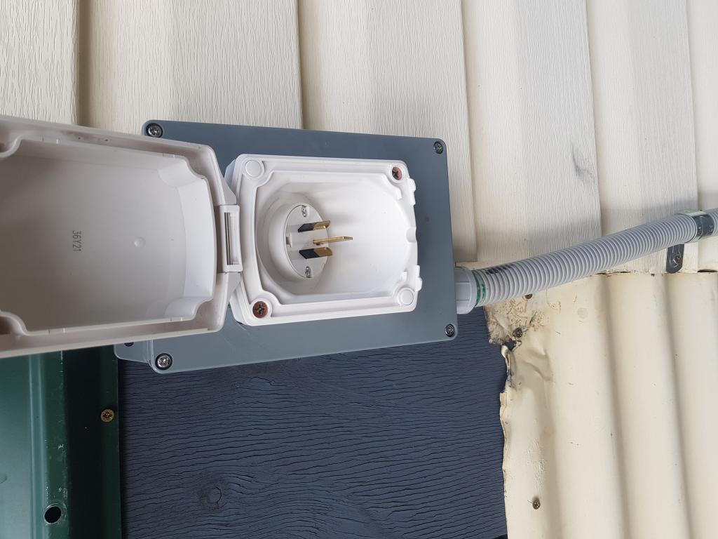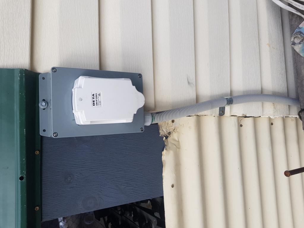 this is the setup I use, got a standard " caravan " input plug from bunnings, and mounted it to wall with a breaker etc... works great...