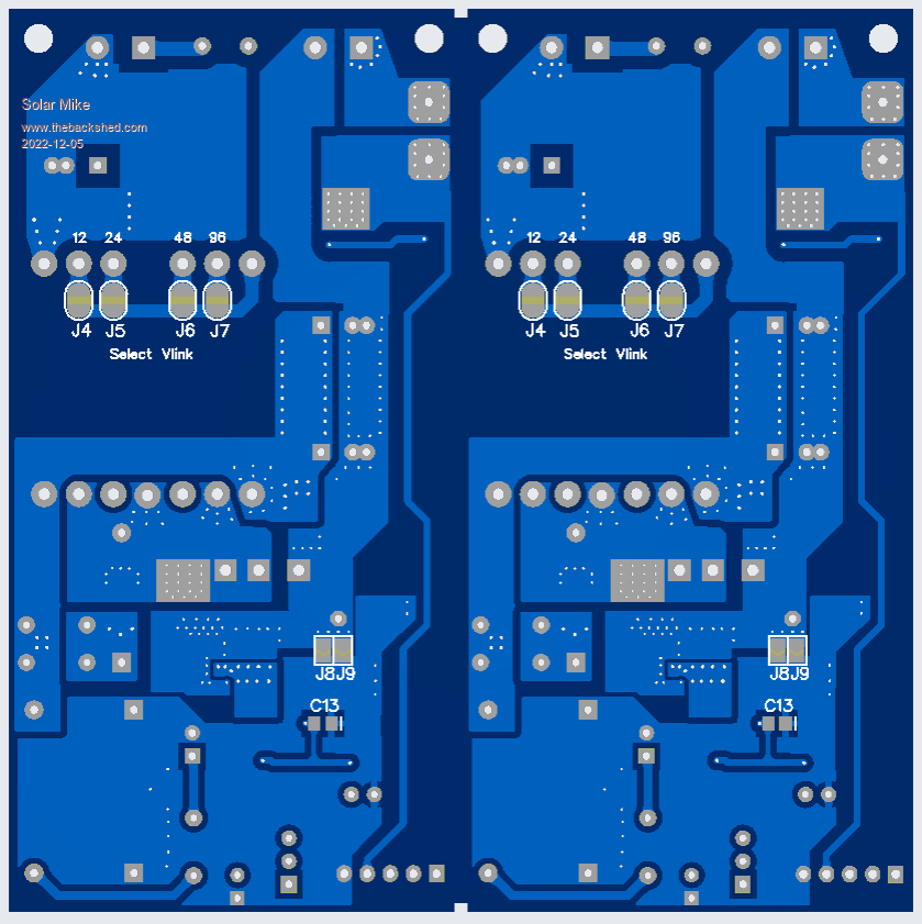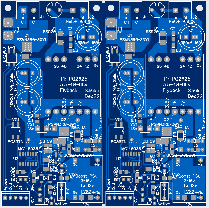 Because the cell voltages are lower than the min required voltage for mosfet drivers, have used a small thumb sized boost module to up the driver voltage to 12v and run off that.