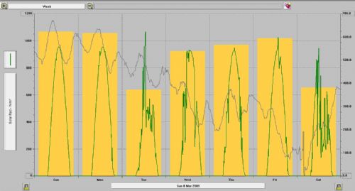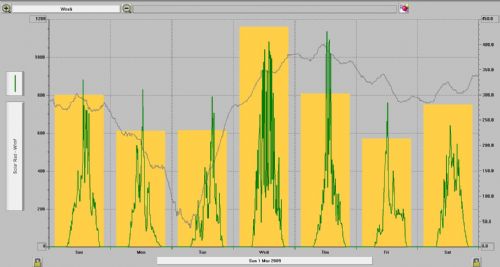 I have solar insolation levels logged from my Davis weather station. I am at latitude 35.5, on the South coast near Victor Harbor. I base my solar as more similar to Melbourne than Adelaide. I have plotted incident solar as W/m^2 and the daily solar energy as Ly. The green jagged trace is the incident solar and the yellow bar graph is the daily energy. The peaks above 1000 are from reflected light cloud effects.