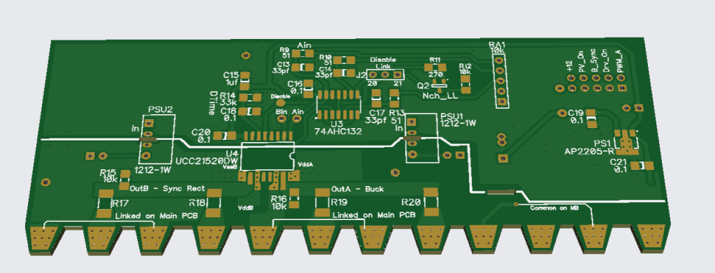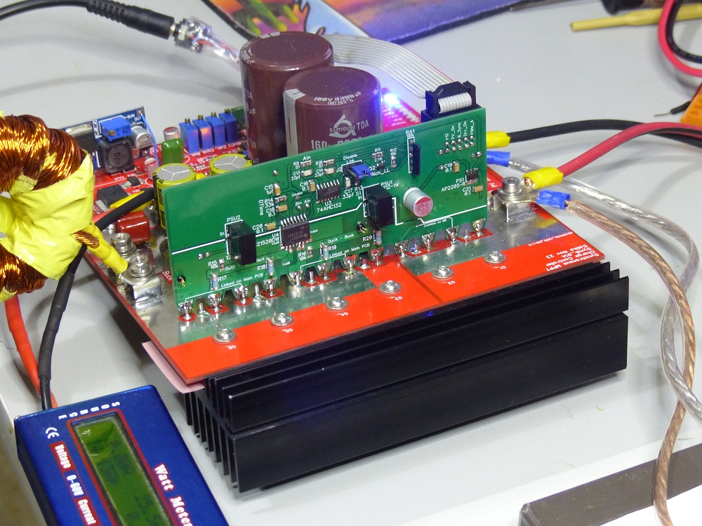 The mosfet driver circuitry has been placed on a small sub pcb that connects using a 10pin IDC ribbon connector, the pcb sits atop the mosfet leg pins, soldered to the legs protruding through the main board. This arrangement allows the high mosfet currents be isolated away from drive signals that now go direct to the mosfet pins, seems to work very well.