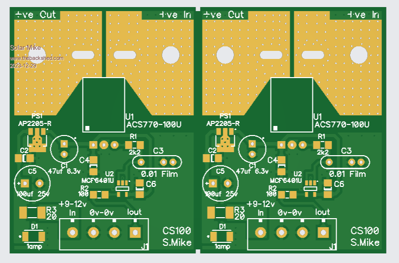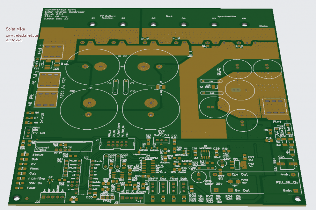 However Vers.2 should fix those issues, have fixed the wiring issue, changed the 0 volt earth plane so has more area and replaced the 50 amp ACS770 current sensor with a smaller 40 amp ACS723-40U. Would rather use multiple smaller controllers with their own PV array than a larger unit; much easier to make chokes and less stress on main electro's etc with lower currents. Also altered the driver pcb by removing redundant mosfet connections.