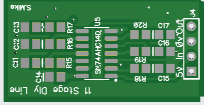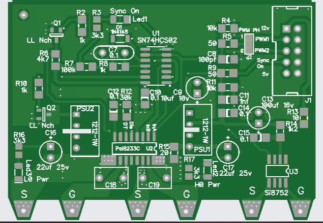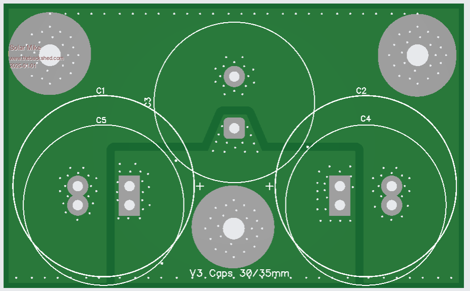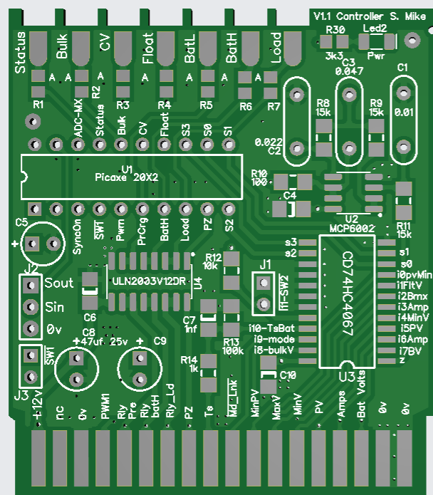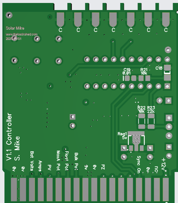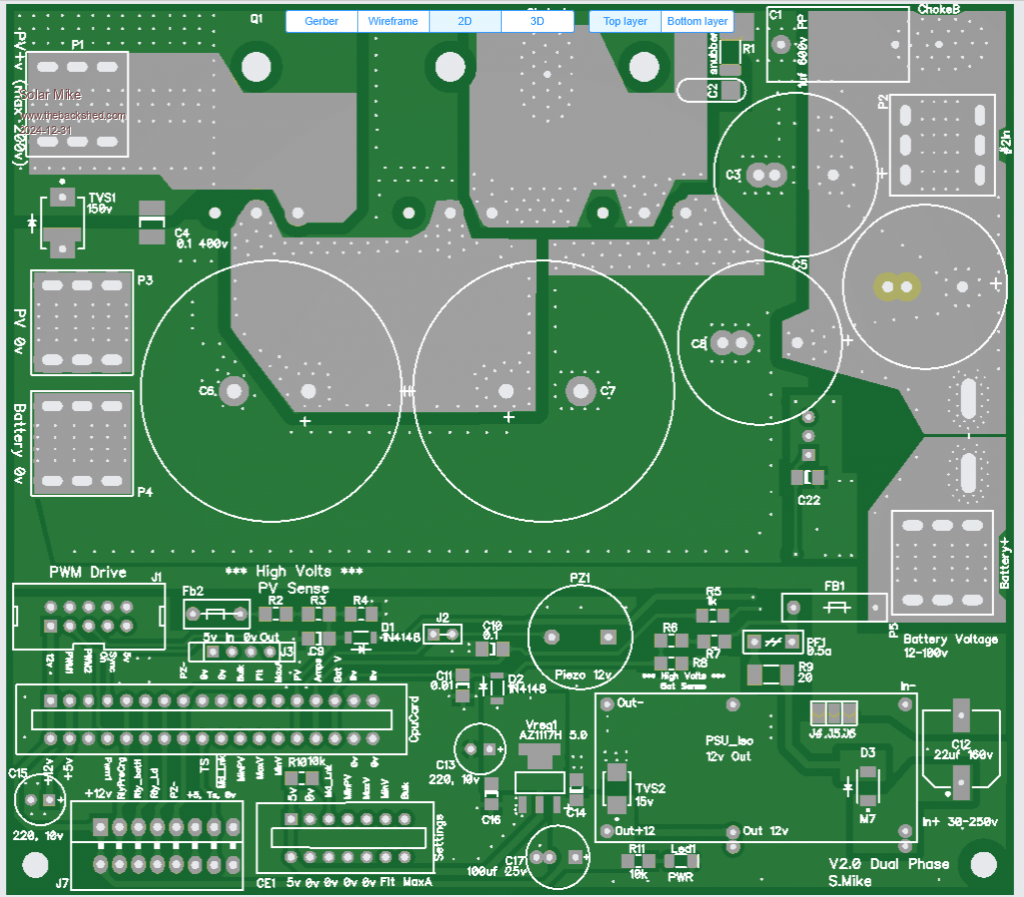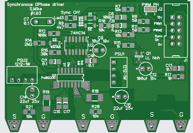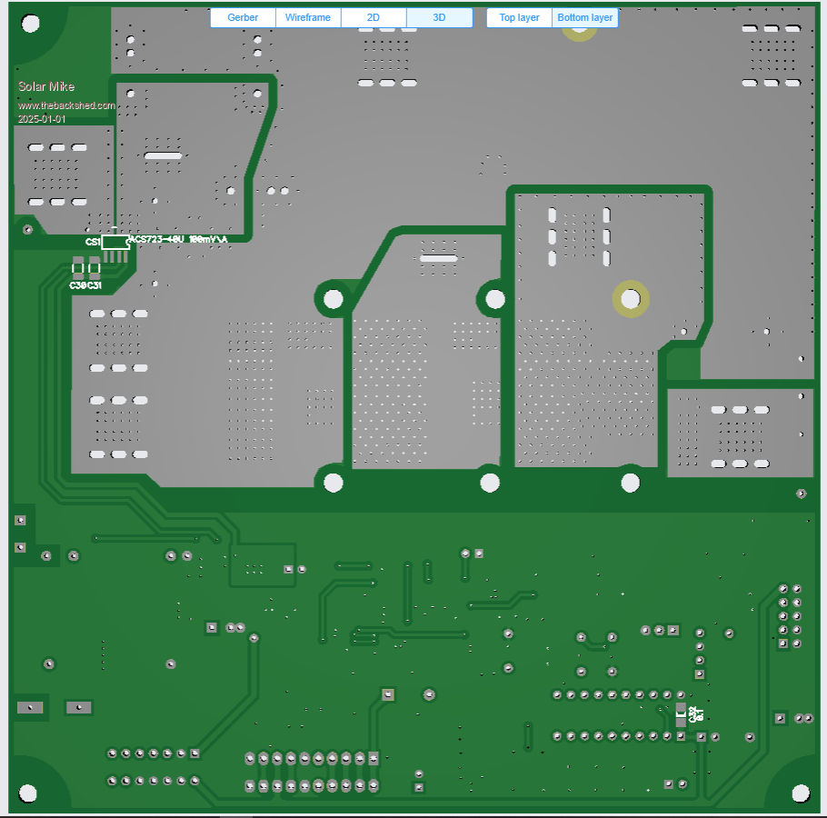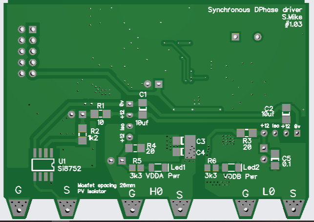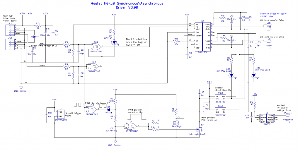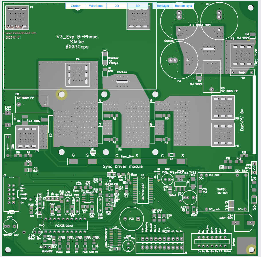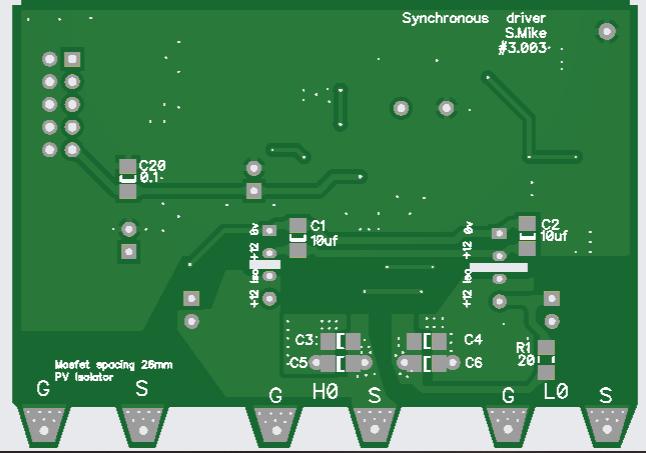 I have altered the driver card somewhat, in removing the gate drive resistors as these are now on the main power board, and simplified the circuit by using a quad nor gate with schmitt trigger inputs. Both the Pai8233C mosfet driver and the Nor gate SN74HCS02 are very cheap at LCSC. The synchronous mosfet driver will automatically switch to asynchronous mode when the input sync signal goes to logic 0, this happens on low charge currents < 1 amp and prevents the synchronous mosfet circuit acting as a boost converter with possible smoke release on very low duty cycles. When PWM signals are present the pulse extender turns on the power to the 2 small 12v isolated bias supplies and the PV isolation mosfet drive. The IDC input cable input has 2 PWM drive phases present, a solder blob jumper selects one to use, the IDC can extend to another power board\drive card, without any cpu or other components; this will drive the buck circuit 180 degrees from the first, using a common PV input to both power boards. Have drawn up the driver schematic to make sure the new PCB has no errors. Will send the new board away shortly. PCB, 70 x 50mm: Cheers Mike Edited 2025-01-04 21:02 by Solar Mike |