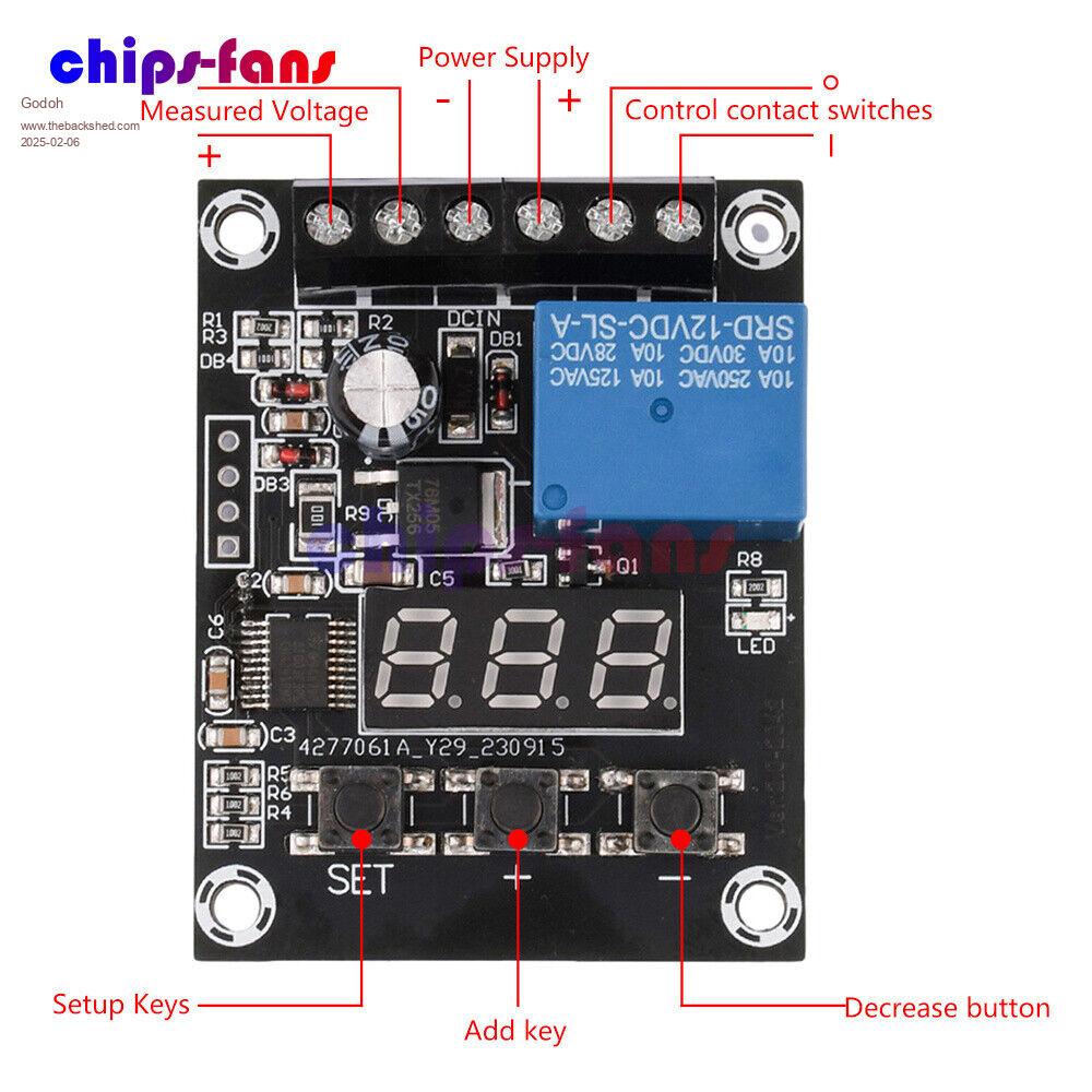 So, you see, it's *important* that the voltage controlled relay turns off at a set higher voltage than it turns on again (I use 0.5V difference) - this is called hysteresis and prevents the relay turning on/off rapidly.
