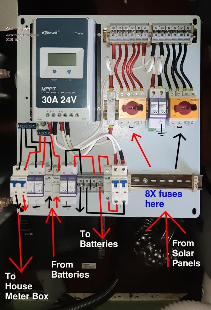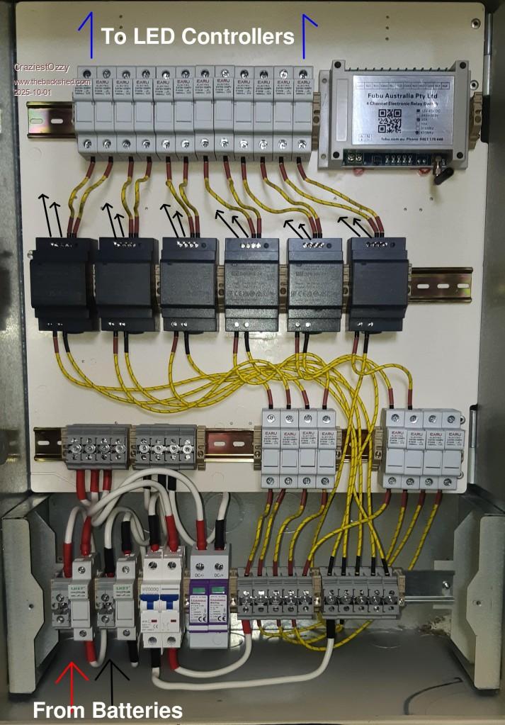 As far as the Australian Standards are concerned, I have to the best of my knowledge, avoided the requirement to have a sparkie install my spaghetti wiring. My haz-mat suit for the lead acid batteries, is a blue singlet, stubbie shorts and a terry towel hat. Foot protection is a pair of thongs.