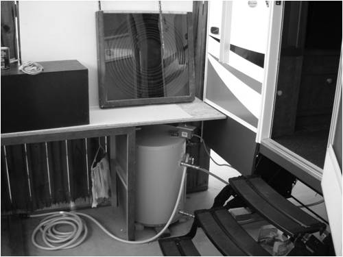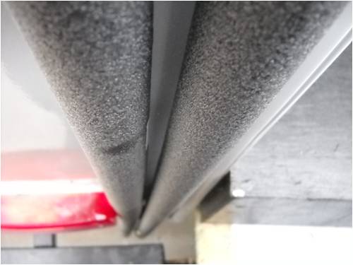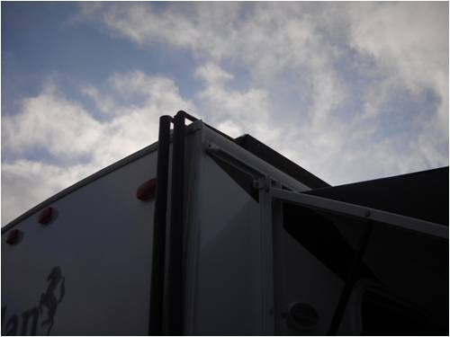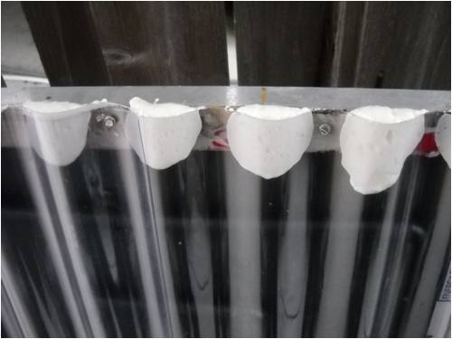 This next shot is from the roof looking down the inlet and oulet pipes. The pipes are anchored to the side of my RV with clamps over the thermo-cell insulation.
