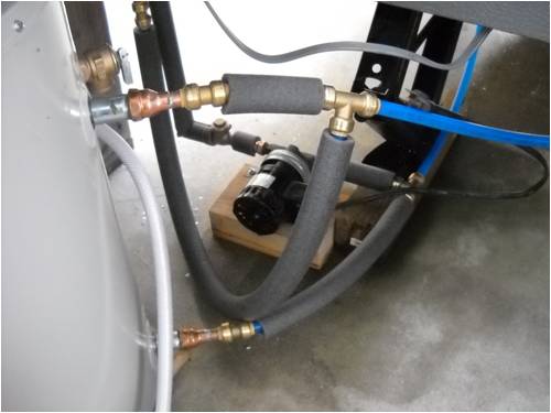 The water will be pumped through it from one end of the pipe to the other (not sure which way will be in and which will be out -- but that doesn't matter). I'll draw the cooler water off the bottom of my 20-gallon storage tank and return it to the top using "T" fittings on both the cold and hot lines at the side of the heater. All lines exposed to air will be insulated with thermo-cell pipe insulation and painted to resist UV decay.