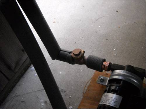 Here's a tight shot of the little swing-check valve I put in the output side of the pumping system. This will prevent back-flowing of water. I also put in what's called a solar loop (see photo above--large half-circle insulated pipe) in the outlet pipe leading to the upper (hot) outlet on the receiver. Heated water doesn't like traveling against gravity (down) and the "loop" facilitates that and keeps the hot water in the tank.