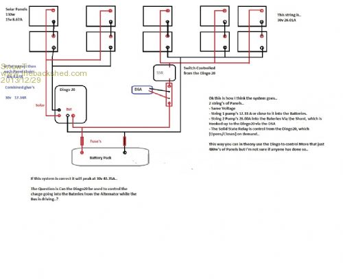 Now your talking, using relays so as the Dingo can handle more then 20 amps solar. But then I`m reading a very fuzzy diagram. Plasmatronics manuals are tops you`ll get all you need from them, just a matter of getting your head round them. I assume from your diagram that is what you`ve done. Now you can look to the load side of things you`ll find the Dingo will do that ensuring your battery does not get drained too low, once again using relays if your load is in excess of 20amps. Would suggest if you wish to also charge from your vehicles alternator you wire it through a manual switched relay direct to your battery. The Dingo will sense your batteries charge and control the solar input. The KISS principle, for reliability. We come from the land downunder. Vic |