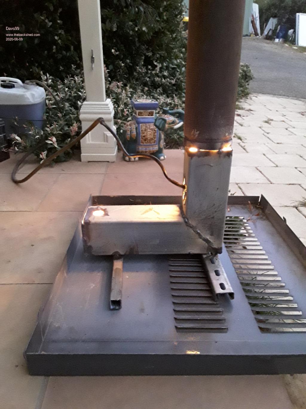 There is a primary air hole in the top of the horizontal leg and cut some holes with the plasma in the upright section for secondary air.  Couple of wide legs for stability and a bit of 4" pipe about 1.5M long for a flue for testing purposes.   Very simple.