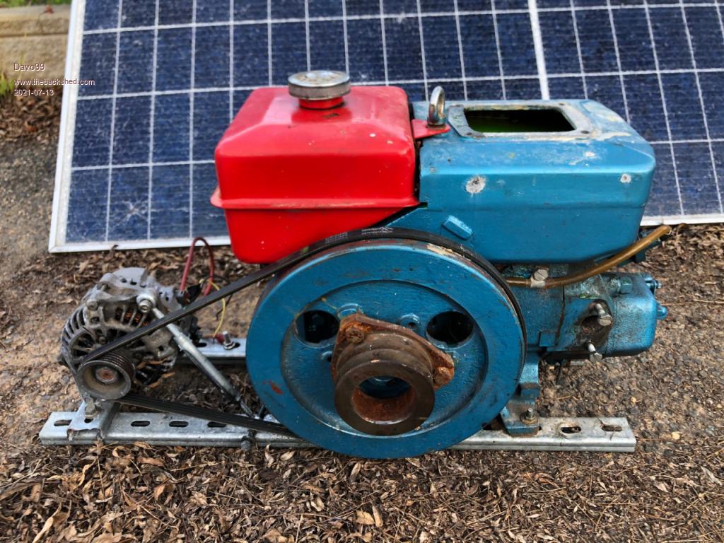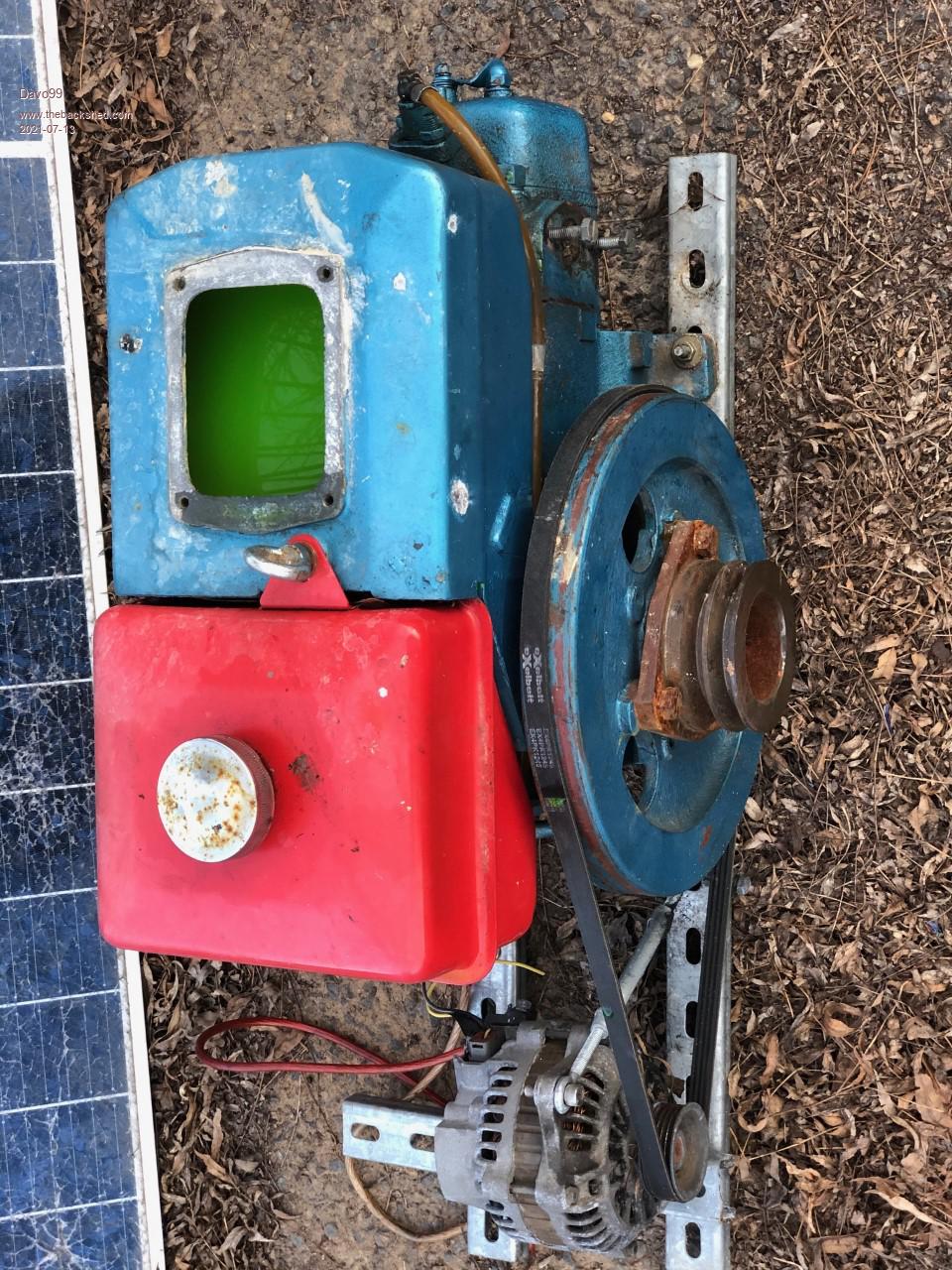 That's if the engine has the power to drive them. I'm certainly open to trying a couple but I have reservations the engine has the grunt. I have 2 alts on my 6 Hp Lister and that seems to be pretty much at it's limit with them. This is only 4.5 Hp BUT, I have long said the other little 3 HP is way under rated and will out pull other 6 Hp engines I have... which unfortunately are all air cooled. The Roid is severely over driving the alts though as it has 23.5" Flywheels Driving about a 3" Pulley. OTOH, The Roid is flat out at 600 RPM so would make the alts turn about 4700 RPM which isn't too fast. In their native vehicular application it's a 5" harmonic Balancer doing up to 6000 Rpm so works out to around a screaming 10000 rpm. The roid seems to be able to pull full RPM and it will certainly roll coal so I haven't seen it restricted in any way. Other things I have read have suggested that about 3 Hp is good for an 80A alt as well. Spose I might be able to get some more power out of 2 alts but I don't think I'll be able to drive them to capacity. 8-10 Hp engine would be perfect for what I want. Was given a 10Hp the other day I have to go get but of course it's air-cooled so not much good for this job. |