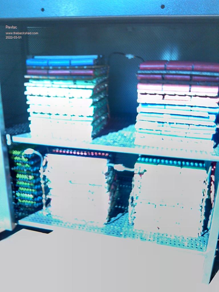 Over time I striped down some more battery packs did all the checks, charged them and made up another 48v battery bank, this was about half, more was added but seem to have lost the photo,  eventually increased the first lot to 100p and the other is 13S 90P in an old tool box..........2017 Plus A bit.