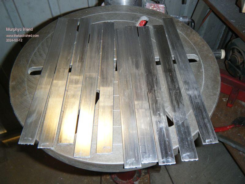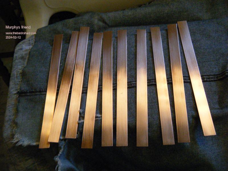 Then the gas was fired up and the tinning began. I did this with 1/2 length of bar at a time, wiping the solder smooth with a rag. Use non synthethic rags, I used an old flannel shirt rag. This process splatters solder drops around, so wear suitable clothing and shoes and do it where the floor can take those solder splats.