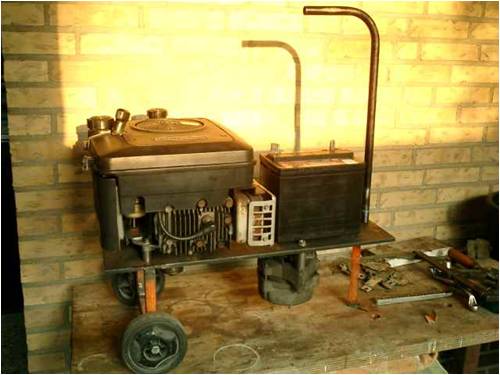 Only picture I have of it in its 'nearly-finished' state. This configuration was chosen to be able to run the alternator normally, with proper cooling (fan turning in the correct direction). Seemed the simplest solution to me to me to solve that problem this way. Wheels and a handlebar complete the portability.