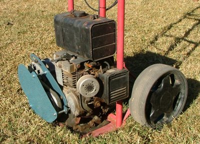 I built a similar setup to Dinges using a 3.5HP briggs vertical shaft. I found it very hard to start because it needs the blade cutting disk as a flywheel. I machined the end off a car axle and added it as a flywheel and that worked. A cutting disk without blades would have been easy if I had it.