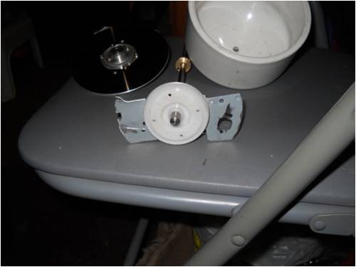 The Next picture shows the optical coupler mounting gear and bracket out of a old printer. the actual disk is in safe keeping till all else is done and ready for it. the optical disk is glued to the gear shown.