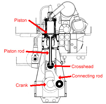 The internals of this engine are a bit different than most automotive engines. The top of the connecting rod is not attached directly to the piston. The top of the connecting rod attaches to a "crosshead" which rides in guide channels. A long piston rod then connects the crosshead to the piston. I assume this is done so the sideways forces produced by the connecting rod are absorbed by the crosshead and not by the piston. Those sideways forces are what makes the cylinders in an auto engine get oval-shaped over time.