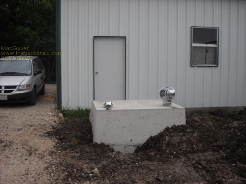Georgen I dont know, they all do, swing out that is. I thought of the uprooted tree or flying truck perching on the door and there's a several-ton hydraulic jack and handle stashed inside the shelter. I'm in a thousand-year flood plain, so I'm not so much worried about water getting in, like in a flash flood. Here's a shot of the thing BEFORE I enclosed it. All but the two little vents are now enclosed in a welded-steel building extension, which covers about 3/4 of it. That way, I can go through the door and enter the shelter without getting pelted with water, hail, ice or debris. It hasen't come to that yet, but that's the plan. . . . . . . Mac Nothing difficult is ever easy! Perhaps better stated in the words of Morgan Freeman, "Where there is no struggle, there is no progress!" Copeville, Texas |