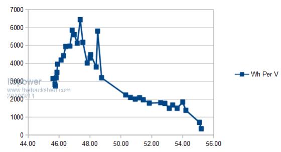 The base axis is busbar voltage and the left axis is Wh per volt reduction. I think this starts to show the actual performance of the cells in a more usefull way.