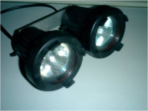 The actual headlights are two waterproof garden lights. These are pretty cheap, use 12V (via a transformer), waterproof and, best of all, use standard MR16 bulbs which means it's easy to replace them with exactly the right bulb for your application, as there's a large selection in MR16 bulbs in all kinds of powers, beam widths, etc.