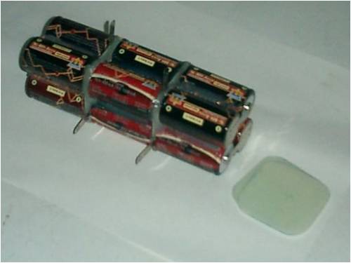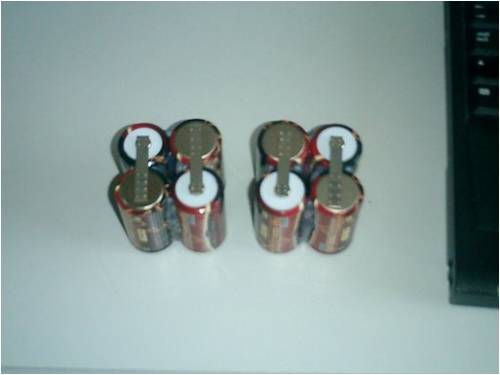 The batterypack to power it all consists of 12 NiMh C-cells of 4000 mAh each for a total system voltage of 14.4V. The batteries were attached to eachother with hotglue, then 0.18 mm thick nickel strips were spotwelded in place (hurray for the CD spotwelder!). More hotglue was added, wires were attached and everything packed in heatshrink. Then it was all inserted in a drink bottle with wide mouth, the spare room stuffed with styrofoam packing chips.