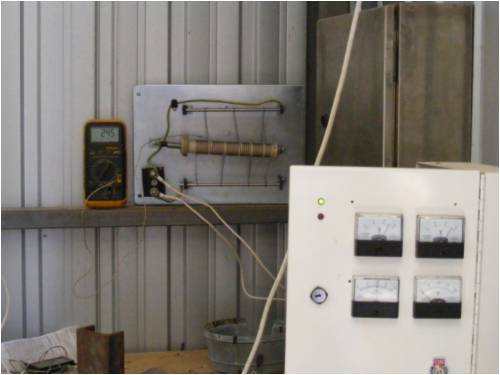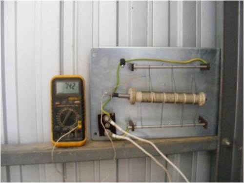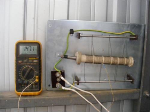 The dumpload is basically a 240 volt mains water heater element and I unwound the nichrome wire from the former. The 2 bars are bussbars and by simply winding a few turns on each bussbar I checked the ohm's with my fluke 865 dmm, with each pass over the ohm's go down acoording to ohm's law and I was aiming for 1 ohm but ended up with about 1.5 ohms which is good enough to cover my RE input. The backing plate is a sheet of 3mm ali and the connecter on the lower left is bakealite so it gave good isolation between the bolts.
