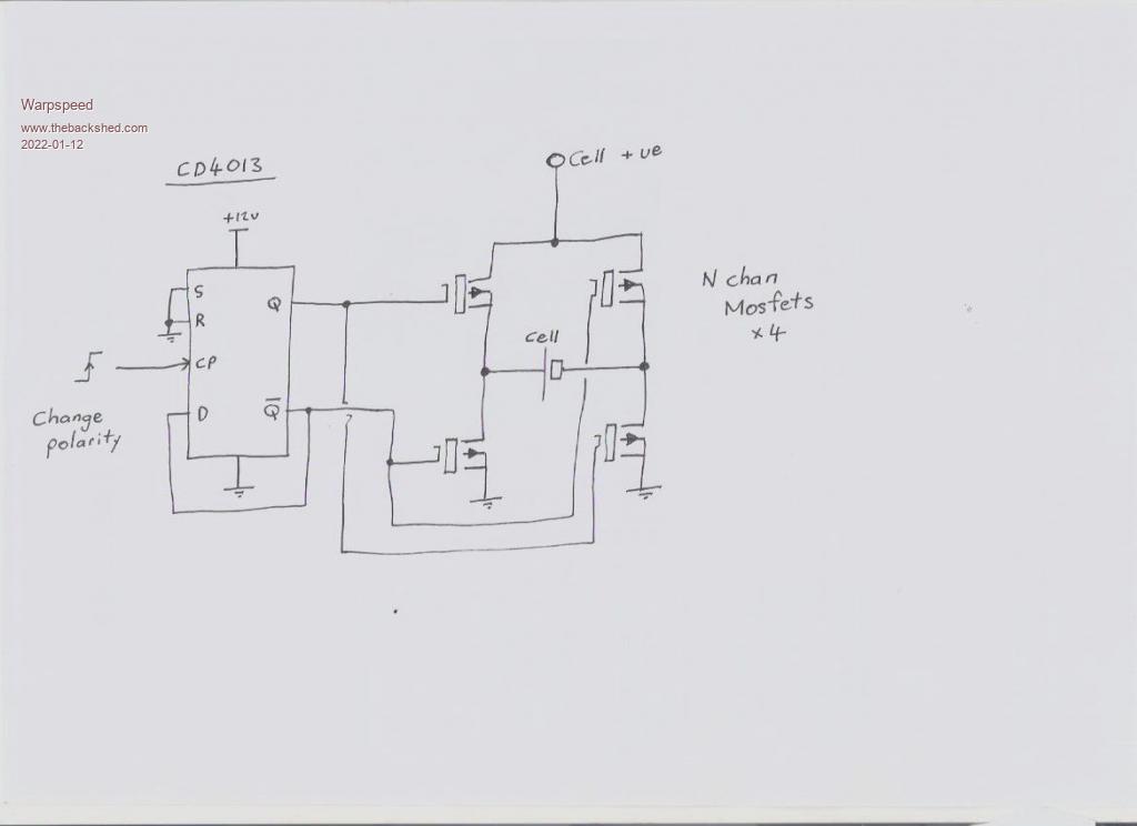 As the "cell" will always be at less than 2.5 volts, if we drive the mosfet gates with a much higher voltage such as +12v, we can connect all our gates directly to a flip flop which really simplifies things a lot.